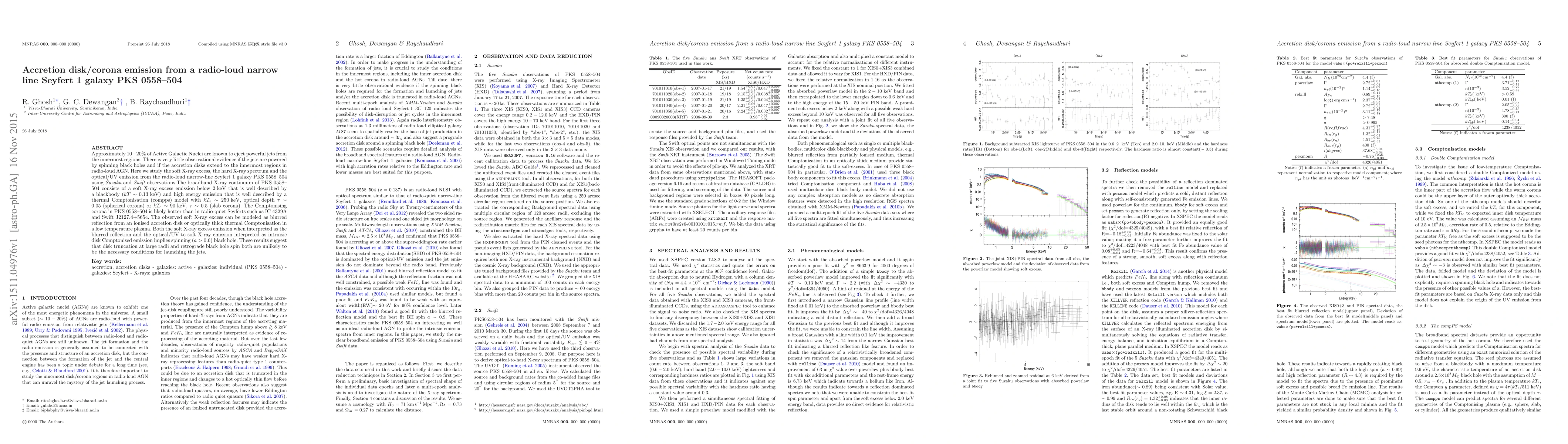 Approximately 10-20% of Active Galactic Nuclei are known to eject powerful jets from the innermost regions. There is very little observational evidence if the jets are powered by spinning black holes and if the accretion disks extend to the innermost regions in radio-loud AGN. Here we study the soft X-ray excess, the hard X-ray spectrum and the optical/UV emission from the radio-loud narrow-line Seyfert 1 galaxy PKS 0558-504 using Suzaku and Swift observations. The broadband X-ray continuum of PKS 0558- 504 consists of a soft X-ray excess emission below 2 keV that is well described by a blackbody (kTe ~ 0.13 keV) and high energy emission that is well described by a thermal Comptonisation (compps) model with kTe ~ 250 keV, optical depth {\tau} ~ 0.05 (spherical corona) or kTe ~ 90 keV, {\tau} ~ 0.5 (slab corona). The Comptonising corona in PKS 0558-504 is likely hotter than in radio-quiet Seyferts such as IC 4329A and Swift J2127.4+5654. The observed soft X-ray excess can be modelled as blurred reflection from an ionised accretion disk or optically thick thermal Comptonisation in a low temperature plasma. Both the soft X-ray excess emission when interpreted as the blurred reflection and the optical/UV to soft X-ray emission interpreted as intrinsic disk Comptonised emission implies spinning (a > 0.6) black hole. These results suggest that disk truncation at large radii and retrograde black hole spin both are unlikely to be the necessary conditions for launching the jets.