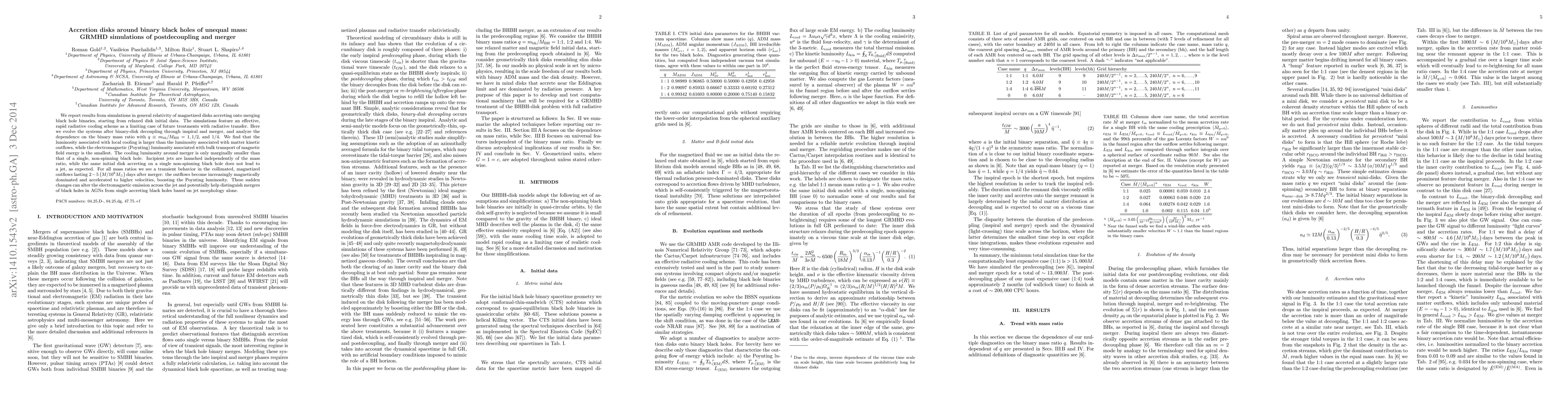This study uses GRMHD simulations to analyze the accretion disks around binary black holes of unequal mass during and after their merger, focusing on luminosity and jet formation. The results show that cooling luminosity remains significant post-merger, while Poynting luminosity from magnetic field energy transport increases in transient, magnetically dominated outflows, potentially aiding in distinguishing black hole mergers from single accretors based on jet morphology.
