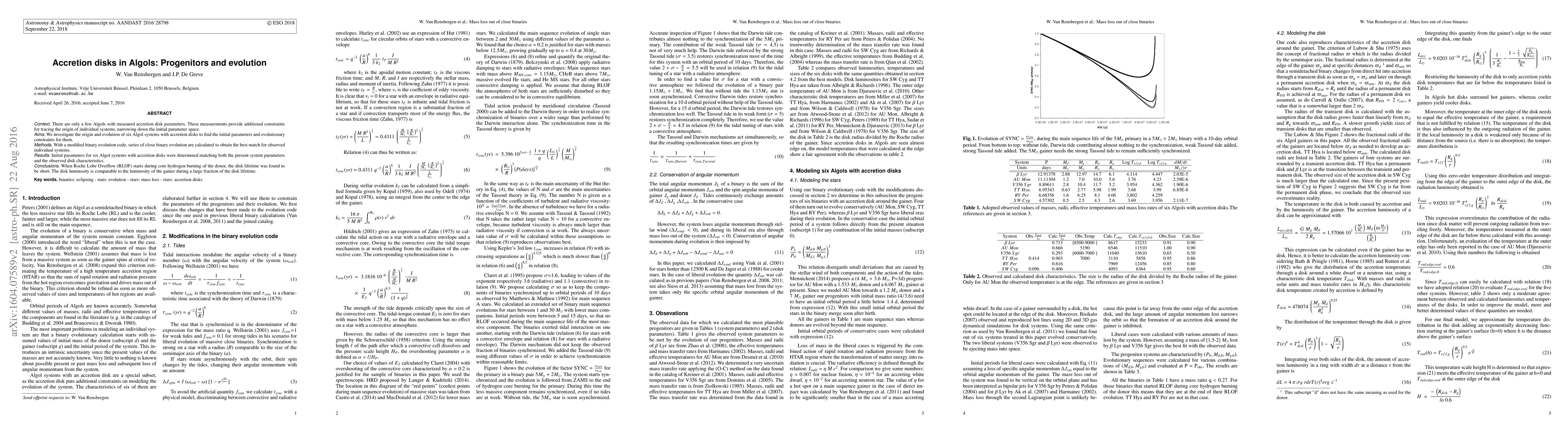 There are only a few Algols with measured accretion disk parameters. These measurements provide additional constraints for tracing the origin of individual systems, narrowing down the initial parameter space. We investigate the origin and evolution of 6 Algol systems with accretion disks to find the initial parameters and evolutionary constraints for them. With a modified binary evolution code, series of close binary evolution are calculated to obtain the best match for observed individual systems. Initial parameters for 6 Algol systems with accretion disks were determined matching both the present system parameters and the observed disk characteristics. When RLOF starts during core hydrogen burning of the donor, the disk lifetime was found to be short. The disk luminosity is comparable to the luminosity of the gainer during a large fraction of the disk lifetime.