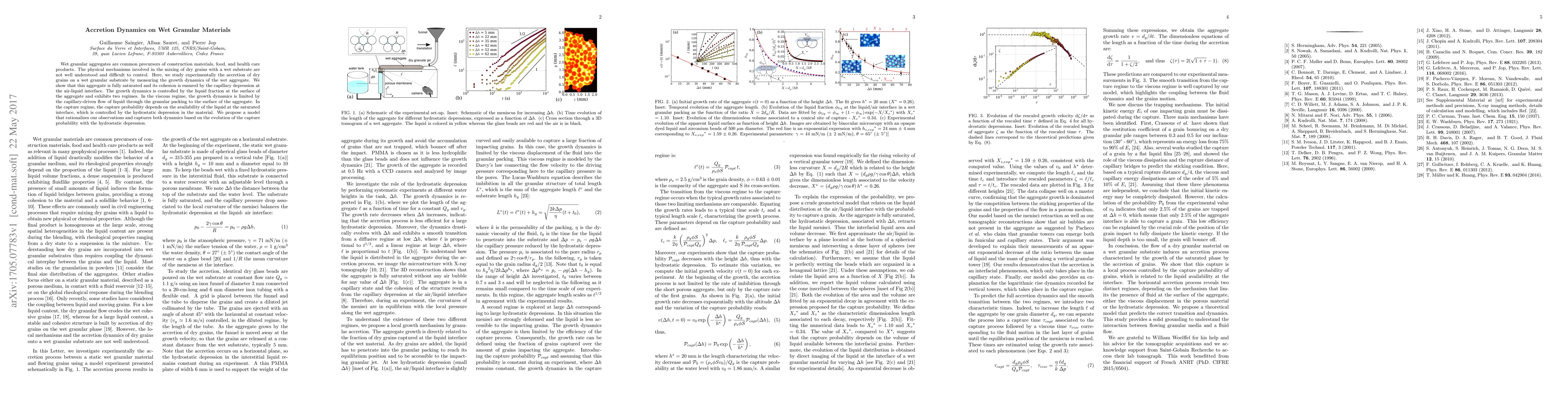 This study experimentally investigates the accretion dynamics of dry grains onto wet granular aggregates, revealing two growth regimes: viscous and capture. The cohesion of the saturated aggregate is maintained by capillary depression at the air-liquid interface, with growth dynamics governed by the surface liquid fraction and hydrostatic depression.