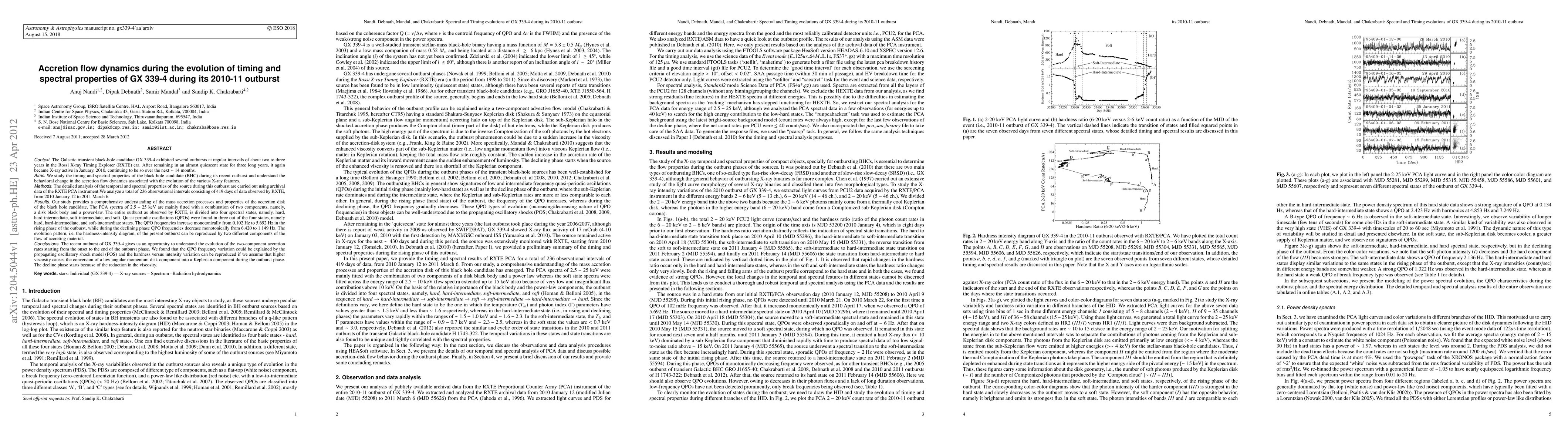 This study analyzes the timing and spectral properties of the black hole candidate GX 339-4 during its 2010-11 outburst, revealing four spectral states and quasi-periodic oscillations. The findings suggest the evolution of accretion dynamics, explained by the propagating oscillatory shock model and varying viscosity.