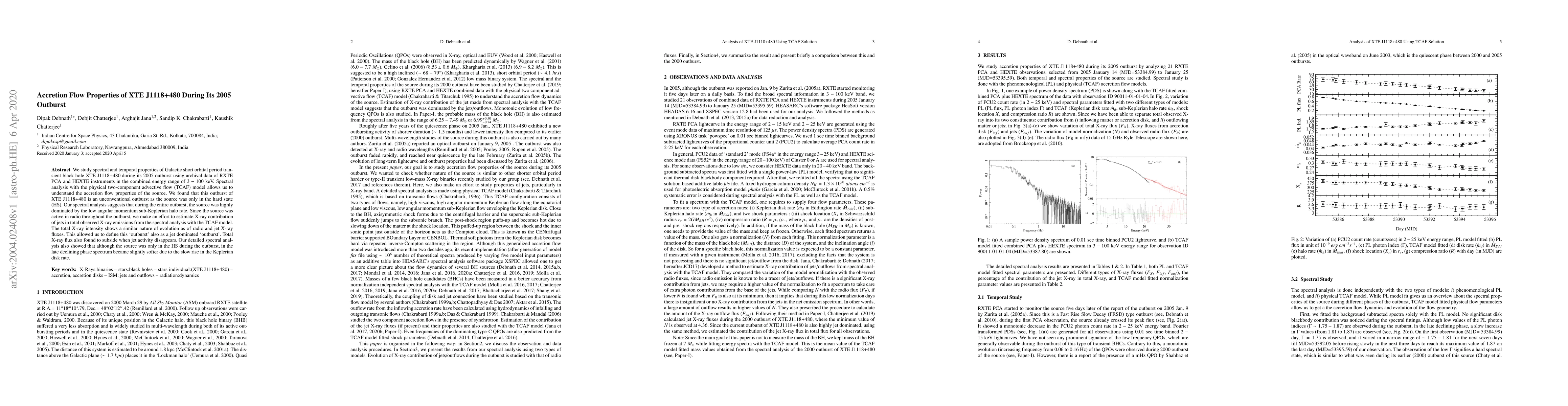 We study spectral and temporal properties of Galactic short orbital period transient black hole XTE J1118+480 during its 2005 outburst using archival data of RXTE PCA and HEXTE instruments in the combined energy range of $3-100$ keV. Spectral analysis with the physical two-component advective flow (TCAF) model allows us to understand the accretion flow properties of the source. We found that this outburst of XTE J1118+480 is an unconventional outburst as the source was only in the hard state (HS). Our spectral analysis suggests that during the entire outburst, the source was highly dominated by the low angular momentum sub-Keplerian halo rate. Since the source was active in radio throughout the outburst, we make an effort to estimate X-ray contribution of jets in total observed X-ray emissions from the spectral analysis with the TCAF model. The total X-ray intensity shows a similar nature of evolution as of radio and jet X-ray fluxes. This allowed us to define this `outburst' also as a jet dominated `outburst'. Total X-ray flux also found to subside when jet activity disappears. Our detailed spectral analysis also showed that although the source was only in the HS during the outburst, in the late declining phase spectrum became slightly softer due to the slow rise in the Keplerian disk rate.