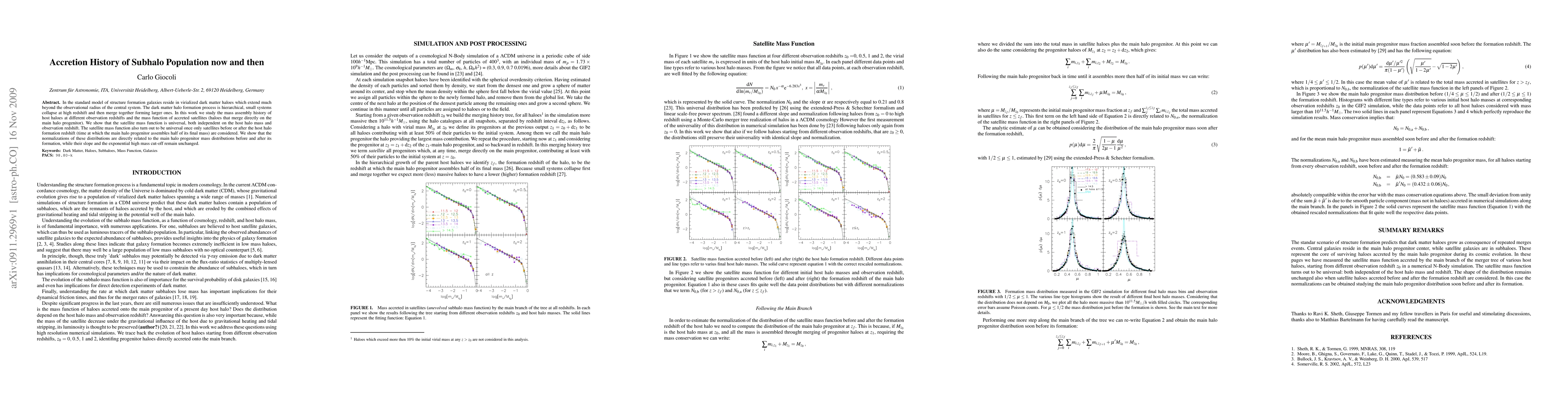 In the standard model of structure formation galaxies reside in virialized dark matter haloes which extend much beyond the observational radius of the central system. The dark matter halo formation process is hierarchical, small systems collapse at high redshift and then merge together forming larger ones. In this work we study the mass assembly history of host haloes at different observation redshifts and the mass function of accreted satellites (haloes that merge directly on the main halo progenitor). We show that the satellite mass function is universal, both independent on the host halo mass and observation redshift. The satellite mass function also turn out to be universal once only satellites before or after the host halo formation redshift (time at which the main halo progenitor assembles half of its final mass) are considered. We show that the normalizations of these distributions are directly related to the main halo progenitor mass distributions before and after its formation, while their slope and the exponential high mass cut-off remain unchanged.