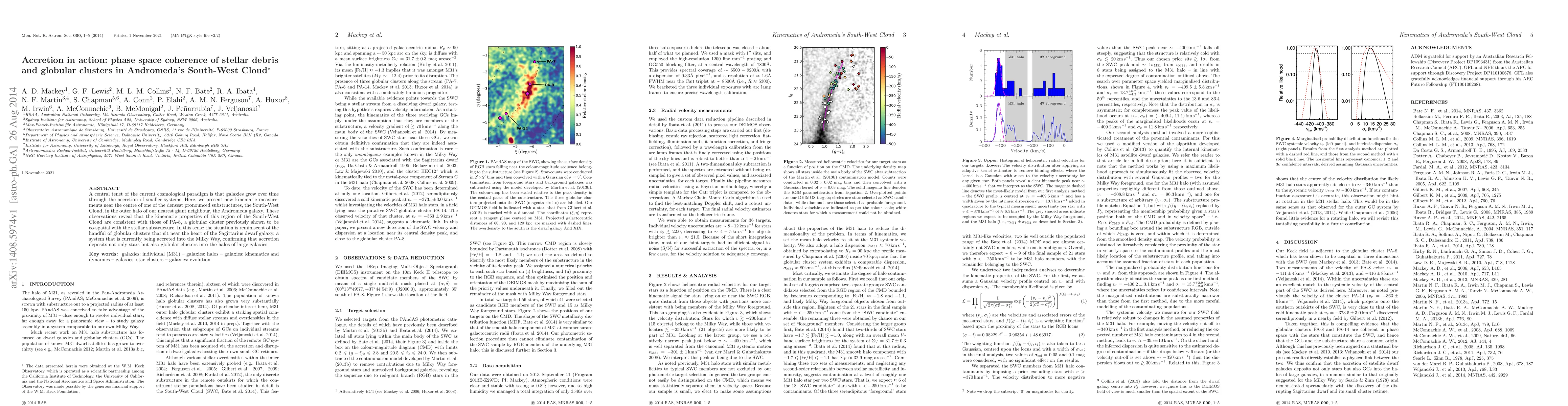 A central tenet of the current cosmological paradigm is that galaxies grow over time through the accretion of smaller systems. Here, we present new kinematic measurements near the centre of one of the densest pronounced substructures, the South-West Cloud, in the outer halo of our nearest giant neighbour, the Andromeda galaxy. These observations reveal that the kinematic properties of this region of the South-West Cloud are consistent with those of PA-8, a globular cluster previously shown to be co-spatial with the stellar substructure. In this sense the situation is reminiscent of the handful of globular clusters that sit near the heart of the Sagittarius dwarf galaxy, a system that is currently being accreted into the Milky Way, confirming that accretion deposits not only stars but also globular clusters into the halos of large galaxies.