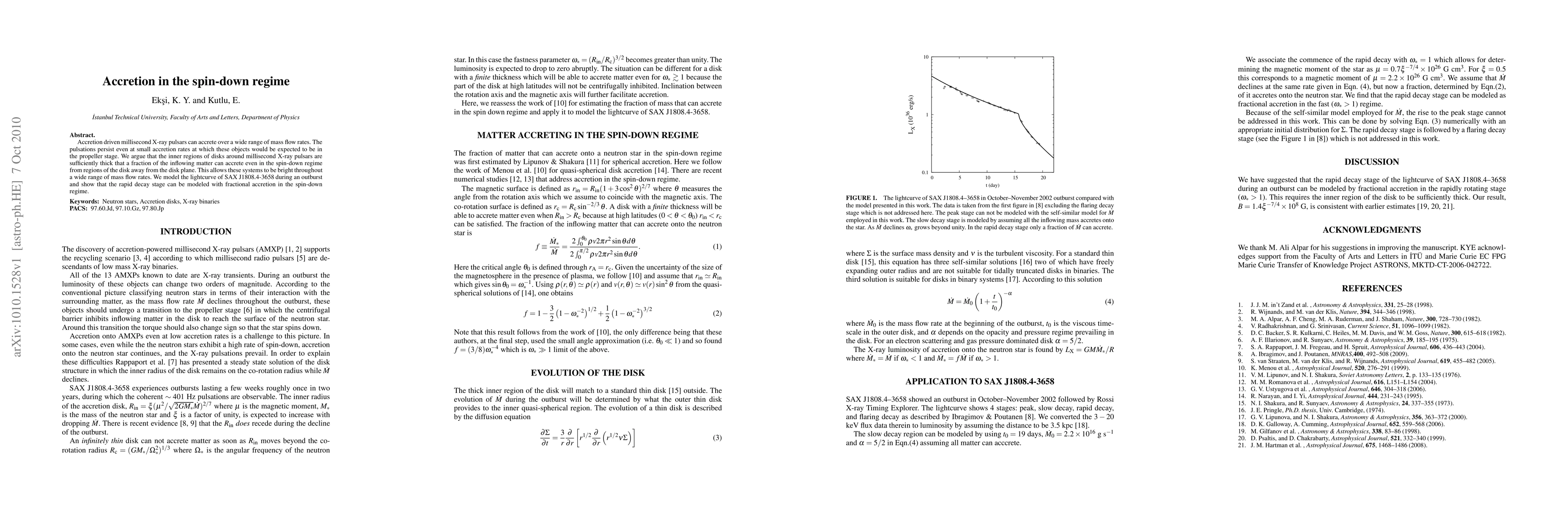 Millisecond X-ray pulsars can maintain brightness across a wide range of mass flow rates due to accretion in the spin-down regime from disk regions outside the plane. This is supported by modeling the lightcurve of SAX J1808.4-3658, which shows rapid decay stages that can be explained by fractional accretion.