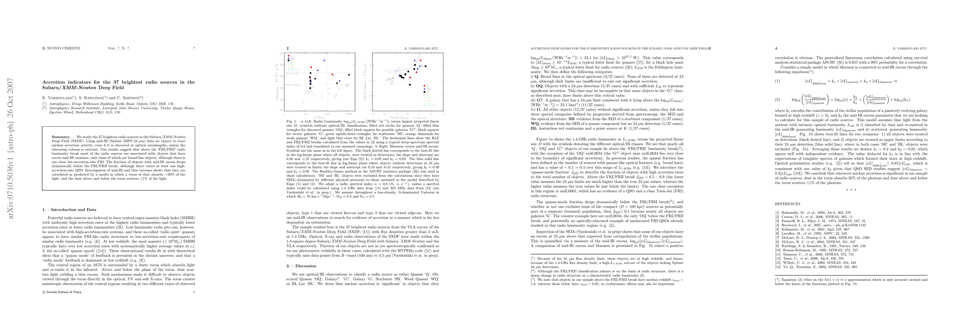 We study the 37 brightest radio sources in the Subaru/XMM-Newton Deep Field (SXDF). Using mid-IR (Spitzer MIPS 24 micron) data we expect to trace nuclear accretion activity, even if it is obscured at optical wavelengths, unless the obscuring column is extreme. Our results suggest that above the `FRI/FRII' radio luminosity break most of the radio sources are associated with objects that have excess mid-IR emission, only some of which are broad-line objects, although there is one clear low-accretion-rate FRI. The fraction of objects with mid-IR excess drops dramatically below the FRI/FRII break, although there exists at least one high-accretion-rate QSO. Investigation of mid-IR and blue excesses shows that they are correlated as predicted by a model in which a torus of dust absorbs ~30% of the light, and the dust above and below the torus scatters >~1% of the light.