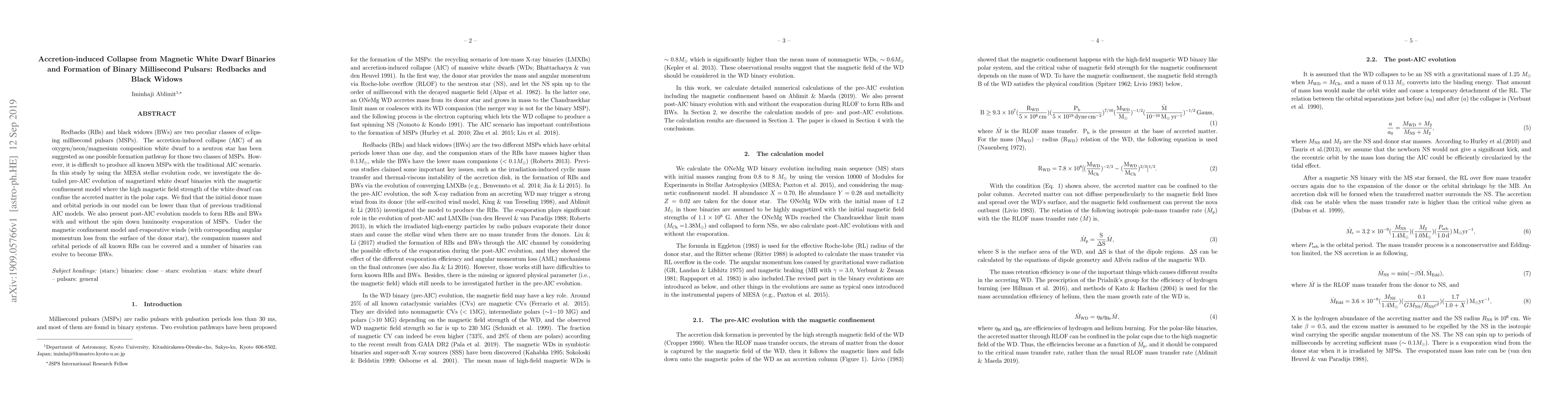 This study investigates the formation of Redbacks and Black Widows, two types of millisecond pulsars, through accretion-induced collapse of magnetized white dwarf binaries using the MESA code. The model shows that lower initial donor masses and orbital periods can produce these pulsars, and evaporative winds can lead to the formation of both Redbacks and Black Widows.