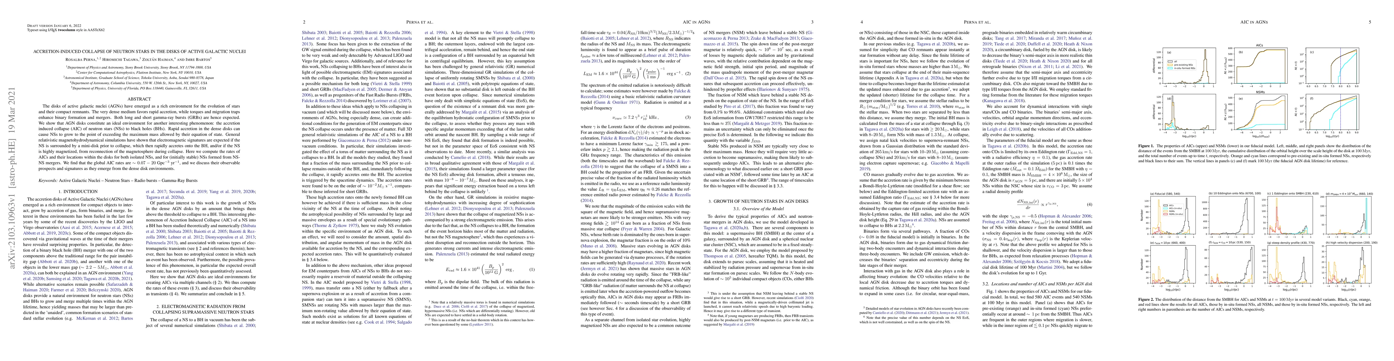 This paper investigates the accretion-induced collapse (AIC) of neutron stars in active galactic nucleus (AGN) disks, showing that rapid accretion can lead to neutron stars exceeding their maximum mass and collapsing into black holes. The study computes AIC rates and discusses potential electromagnetic signatures, finding global rates of $\sim 0.07-20$~Gpc$^{-3}$~yr$^{-1}$ and exploring their observational prospects.