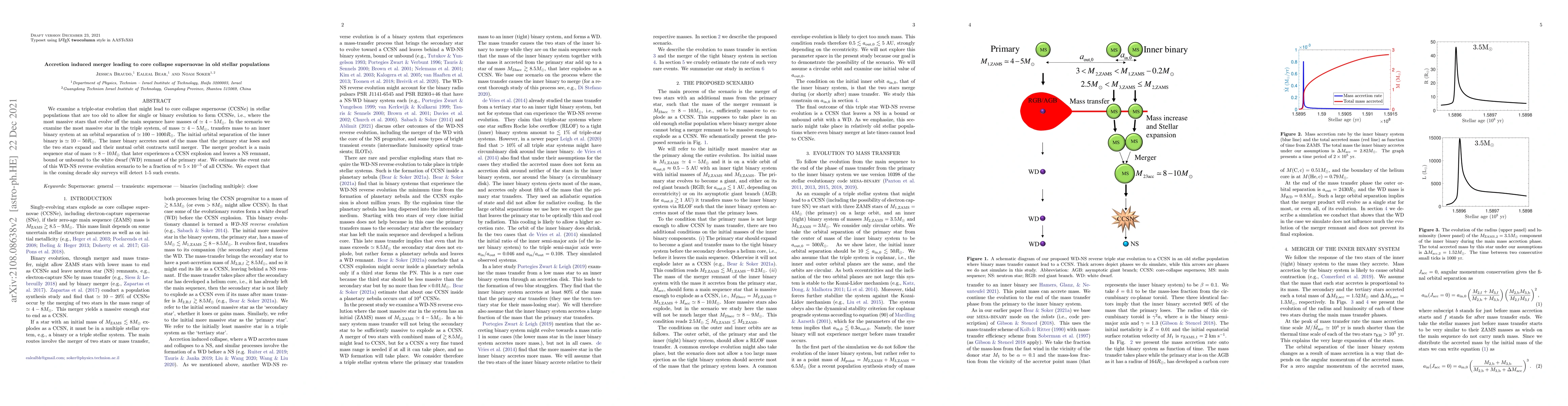 This paper explores a triple-star system where mass transfer from a primary star leads to the merger of an inner binary, resulting in a core collapse supernova (CCSNe) in an old stellar population. The event rate of this rare WD-NS reverse evolution scenario is estimated to be a small fraction of all CCSNe, with 1-5 such events expected to be detected by sky surveys in the next decade.