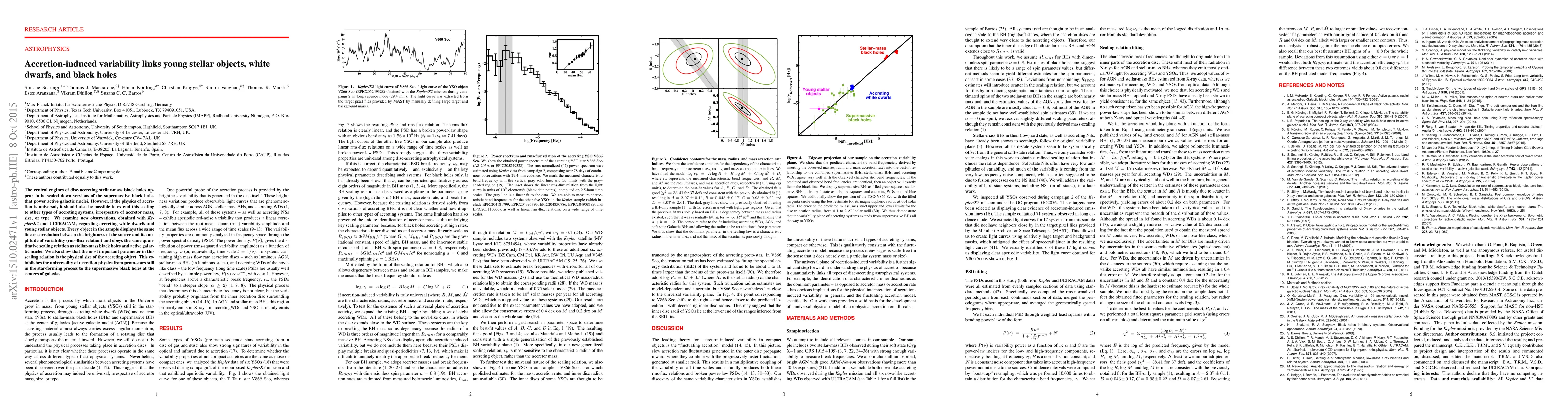 This paper demonstrates that accretion-induced variability in young stellar objects, white dwarfs, and black holes follows a universal scaling relation, suggesting that the physics governing accretion processes are consistent across vastly different accretor masses and sizes. The study highlights the importance of the physical size of the accreting object in determining the variability.