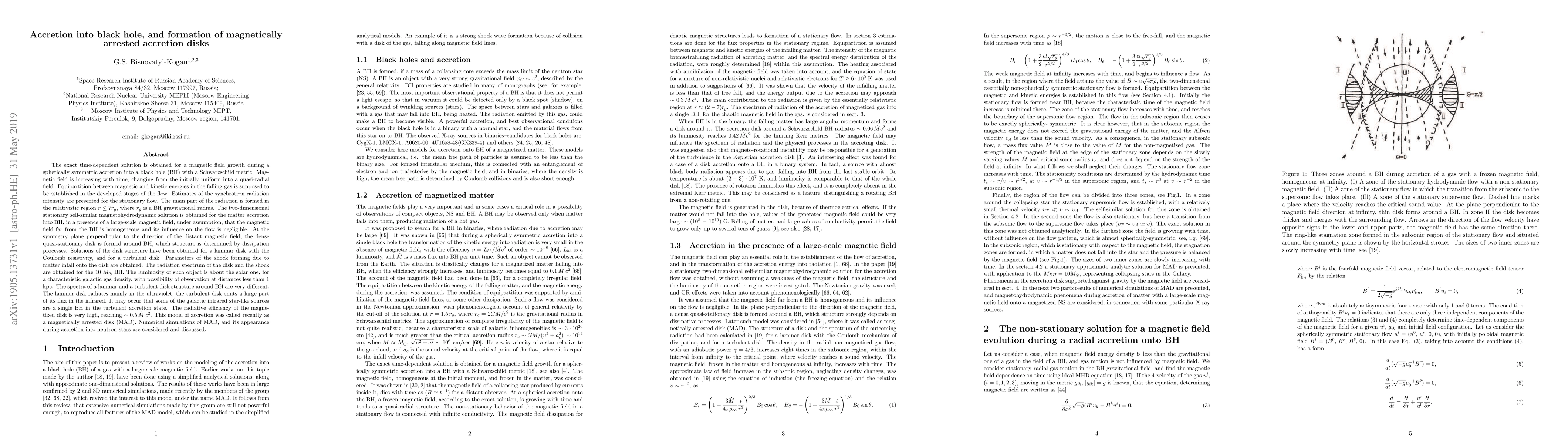 The exact time-dependent solution is obtained for a magnetic field growth during a spherically symmetric accretion into a black hole (BH) with a Schwarzschild metric. Magnetic field is increasing with time, changing from the initially uniform into a quasi-radial field. Equipartition between magnetic and kinetic energies in the falling gas is established in the developed stages of the flow. Estimates of the synchrotron radiation intensity are presented for the stationary flow. The main part of the radiation is formed in the region $r \leq 7 r_g$, here $r_g$ is a BH gravitational radius. The two-dimensional stationary self-similar magnetohydrodynamic solution is obtained for the matter accretion into BH, in a presence of a large-scale magnetic field, when the magnetic field far from the BH is homogeneous and does not influence the flow. At the symmetry plane perpendicular to the direction of the distant magnetic field, the quasi-stationary disk is formed around BH, which structure is determined by dissipation processes. Parameters of the shock forming due to matter infall onto the disk are obtained. The radiation spectrum of the disk and the shock are obtained for the $10\,\, M_\odot$ BH. The luminosity of such object is about the solar one, for a characteristic galactic gas density, with possibility of observation at distances less than 1 kpc. The spectra of a laminar and a turbulent disk structure around BH are very different. The turbulent disk emits a large part of its flux in the infrared. It may occur that some of the galactic infrared star-like sources are a single BH in the turbulent accretion state. The radiative efficiency of the magnetized disk is very high, reaching $\sim 0.5\,\dot M\,c^2$ so it was called recently as a magnetically arrested disk (MAD). Numerical simulations of MAD, and its appearance during accretion into neutron stars are considered and discussed.