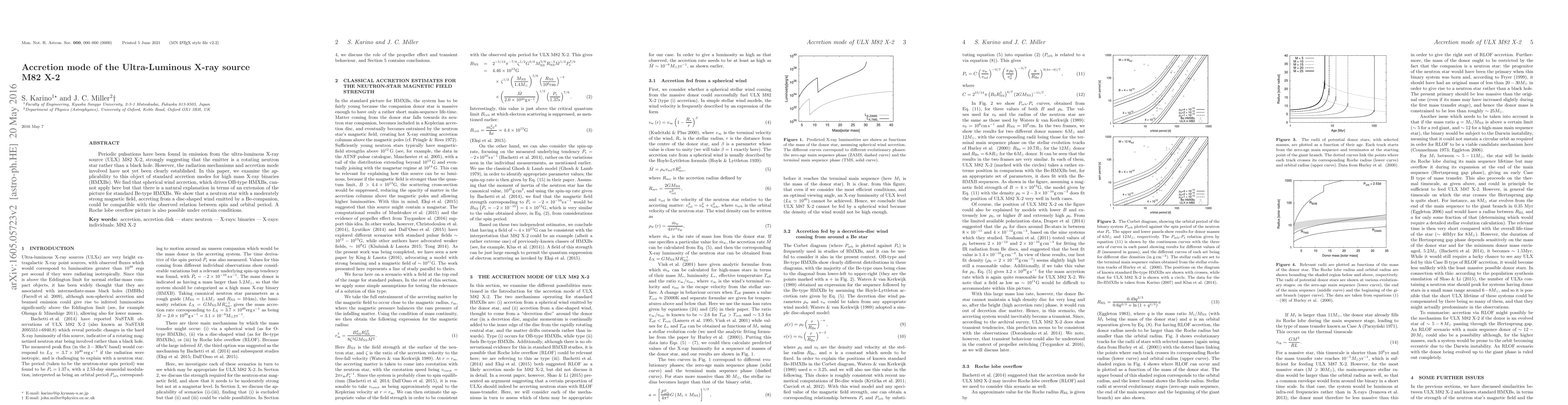 Periodic pulsations have been found in emission from the ultra-luminous X-ray source (ULX) M82 X-2, strongly suggesting that the emitter is a rotating neutron star rather than a black hole. However, the radiation mechanisms and accretion mode involved have not yet been clearly established. In this paper, we examine the applicability to this object of standard accretion modes for high mass X-ray binaries (HMXBs). We find that spherical wind accretion, which drives OB-type HMXBs, cannot apply here but that there is a natural explanation in terms of an extension of the picture for standard Be-type HMXBs. We show that a neutron star with a moderately strong magnetic field, accreting from a disc-shaped wind emitted by a Be-companion, could be compatible with the observed relation between spin and orbital period. A Roche lobe overflow picture is also possible under certain conditions.
