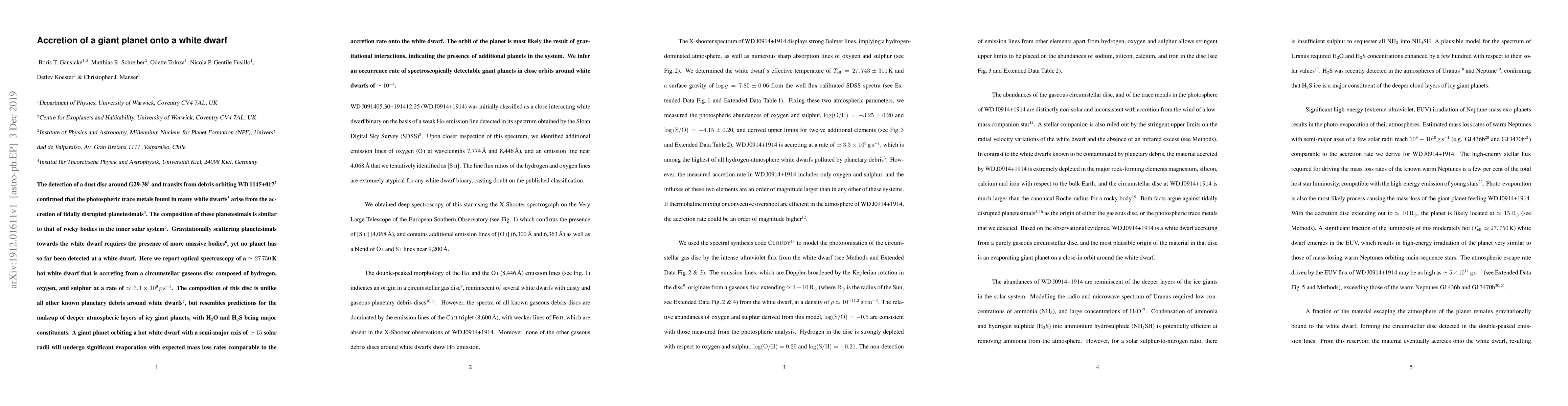 This paper reports the accretion of a giant planet onto a hot white dwarf, revealing a gaseous disc composed of hydrogen, oxygen, and sulphur, suggesting the planet's deep atmospheric layers. The findings indicate the presence of additional planets in the system and estimate an occurrence rate of $\simeq10^{-4}$ for giant planets in close orbits around white dwarfs.