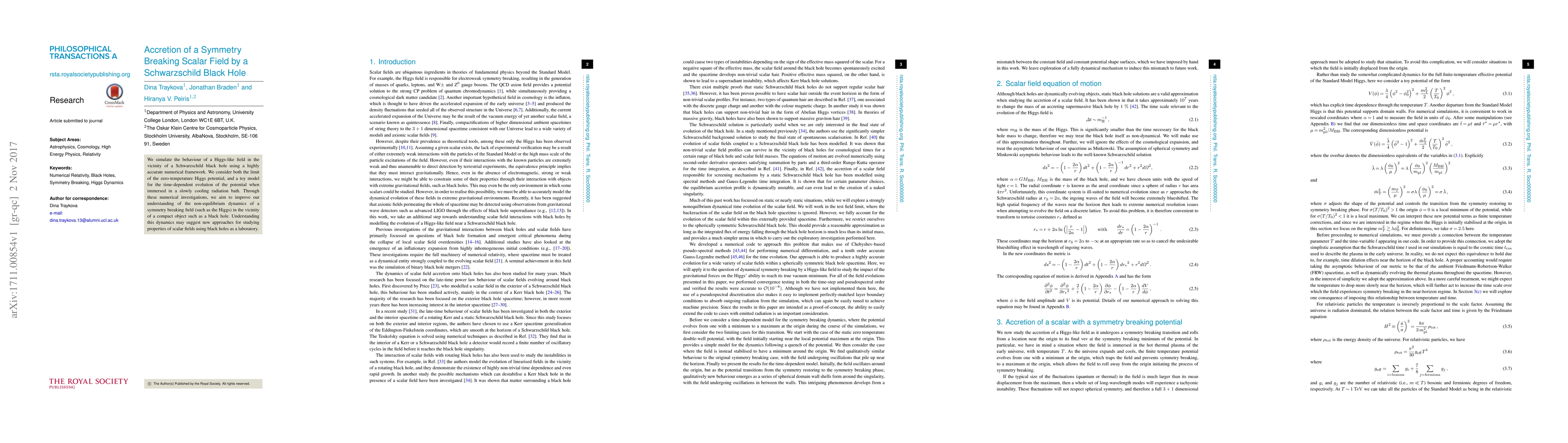 We simulate the behaviour of a Higgs-like field in the vicinity of a Schwarzschild black hole using a highly accurate numerical framework. We consider both the limit of the zero-temperature Higgs potential, and a toy model for the time-dependent evolution of the potential when immersed in a slowly cooling radiation bath. Through these numerical investigations, we aim to improve our understanding of the non-equilibrium dynamics of a symmetry breaking field (such as the Higgs) in the vicinity of a compact object such as a black hole. Understanding this dynamics may suggest new approaches for studying properties of scalar fields using black holes as a laboratory.