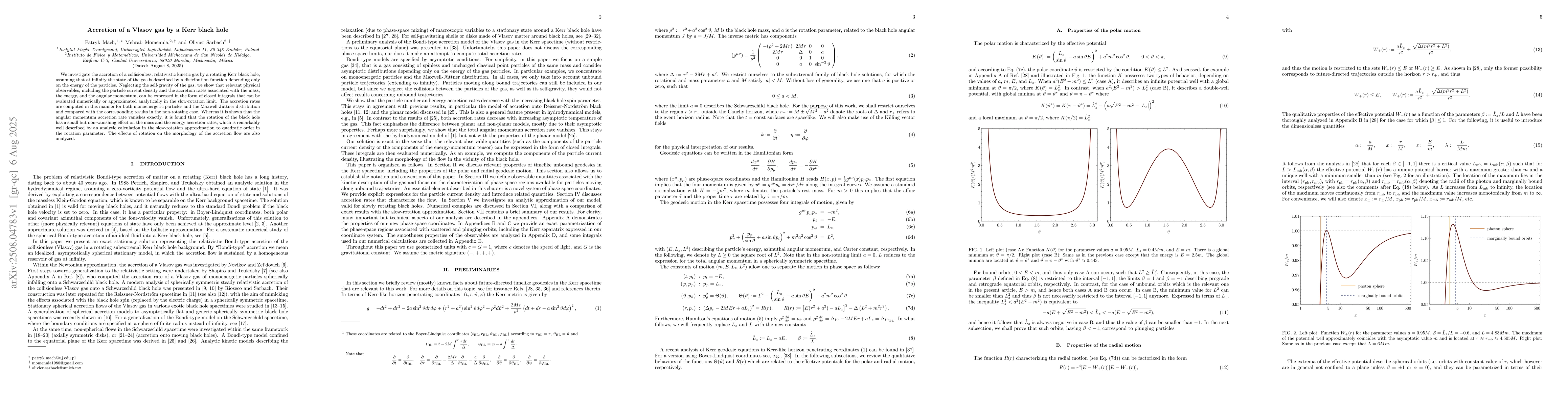 We investigate the accretion of a collisionless, relativistic kinetic gas by a rotating Kerr black hole, assuming that at infinity the state of the gas is described by a distribution function depending only on the energy of the particles. Neglecting the self-gravity of the gas, we show that relevant physical observables, including the particle current density and the accretion rates associated with the mass, the energy, and the angular momentum, can be expressed in the form of closed integrals that can be evaluated numerically or approximated analytically in the slow-rotation limit. The accretion rates are computed in this manner for both monoenergetic particles and the Maxwell-J\"uttner distribution and compared with the corresponding results in the non-rotating case. Whereas it is shown that the angular momentum accretion rate vanishes exactly, it is found that the rotation of the black hole has a small but non-vanishing effect on the mass and the energy accretion rates, which is remarkably well described by an analytic calculation in the slow-rotation approximation to quadratic order in the rotation parameter. The effects of rotation on the morphology of the accretion flow are also analyzed.