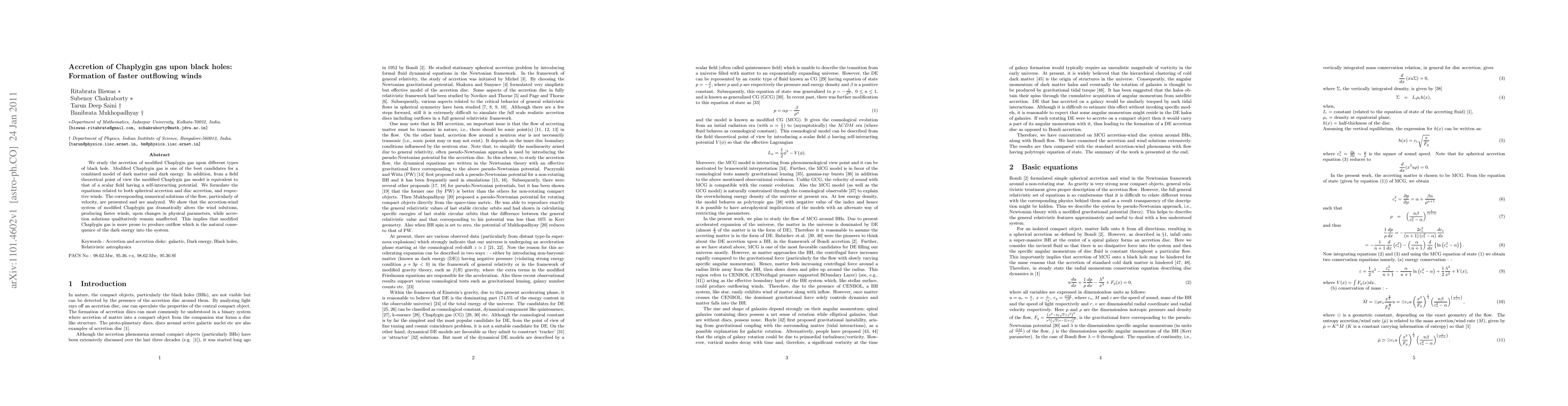 This paper investigates the accretion of modified Chaplygin gas onto black holes, revealing that it leads to the formation of faster outflowing winds compared to traditional models. The study finds that while accretion solutions remain largely unchanged, the wind dynamics are significantly altered, suggesting a stronger outflow propensity due to the unique properties of modified Chaplygin gas.