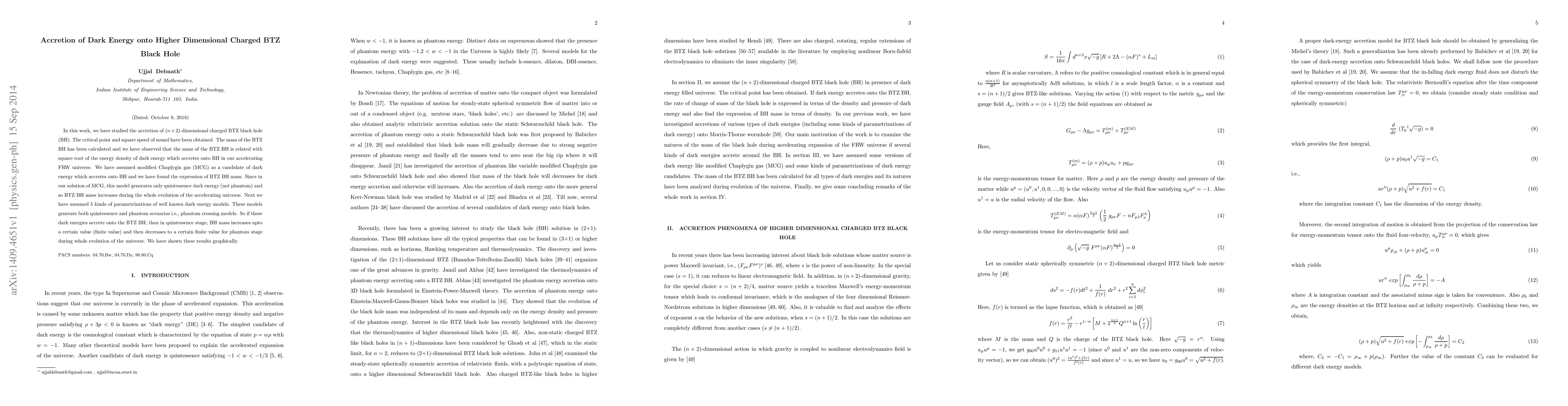 This paper investigates the accretion of dark energy onto a higher-dimensional charged BTZ black hole, finding that the black hole's mass is related to the energy density of dark energy. The study uses modified Chaplygin gas as a dark energy model, showing that BTZ black hole mass increases throughout the universe's evolution, while various parametrizations of dark energy models lead to mass increase followed by decrease in quintessence and phantom stages respectively.