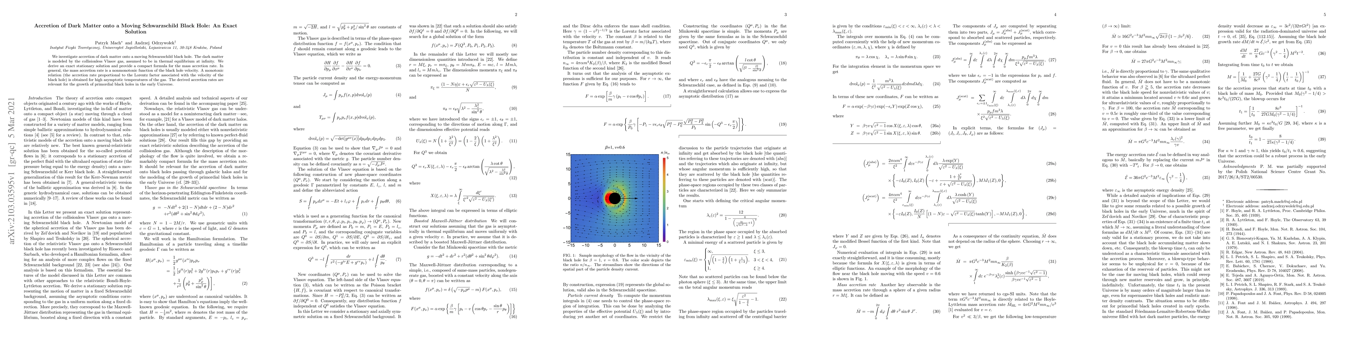 This paper derives an exact stationary solution for the accretion of dark matter onto a moving Schwarzschild black hole, modeled as a collisionless Vlasov gas. The mass accretion rate is shown to be nonmonotonic with black hole velocity, becoming proportional to the Lorentz factor at high gas temperatures, which is significant for understanding the growth of primordial black holes in the early Universe.
