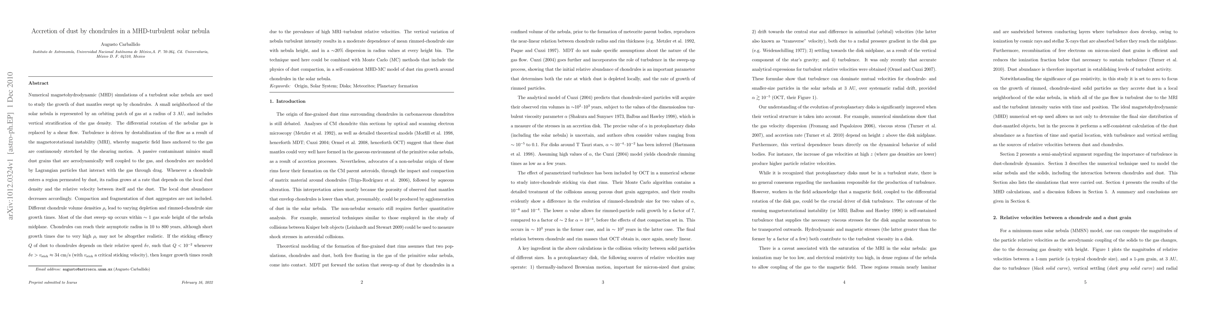 This paper uses MHD simulations to study the accretion of dust by chondrules in a turbulent solar nebula, finding that chondrules grow by sweeping up dust, with most accretion occurring within 1 gas scale height of the midplane. The growth time varies with chondrule density and dust density, and the technique could be extended with Monte Carlo methods for a comprehensive model of dust rim growth.