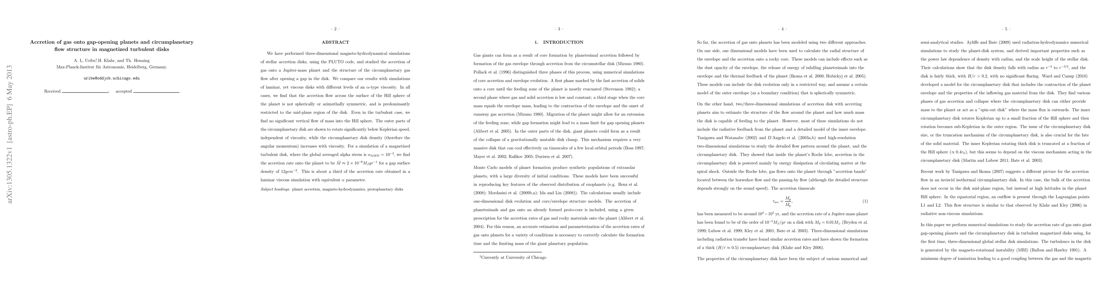Simulations show gas accretion onto a Jupiter-mass planet is mostly restricted to mid-plane region of disk, with accretion rates 1/3 that of equivalent laminar simulations.