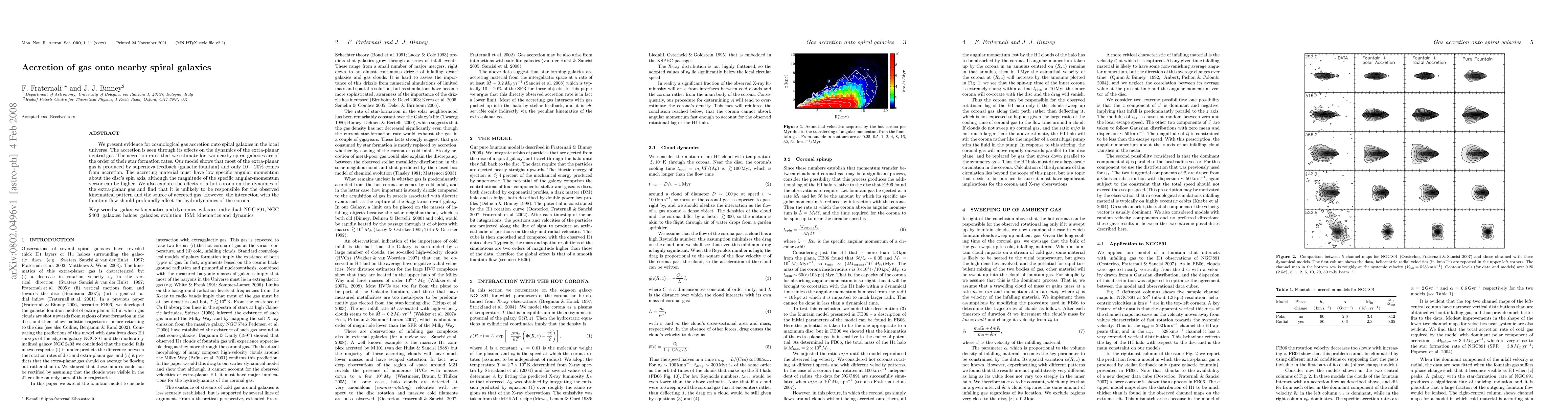This paper provides evidence for cosmological gas accretion onto nearby spiral galaxies, showing that accretion rates are comparable to star formation rates. Most extra-planar gas is attributed to supernova feedback rather than accretion, and a hot corona is unlikely to be responsible for the observed gas dynamics.