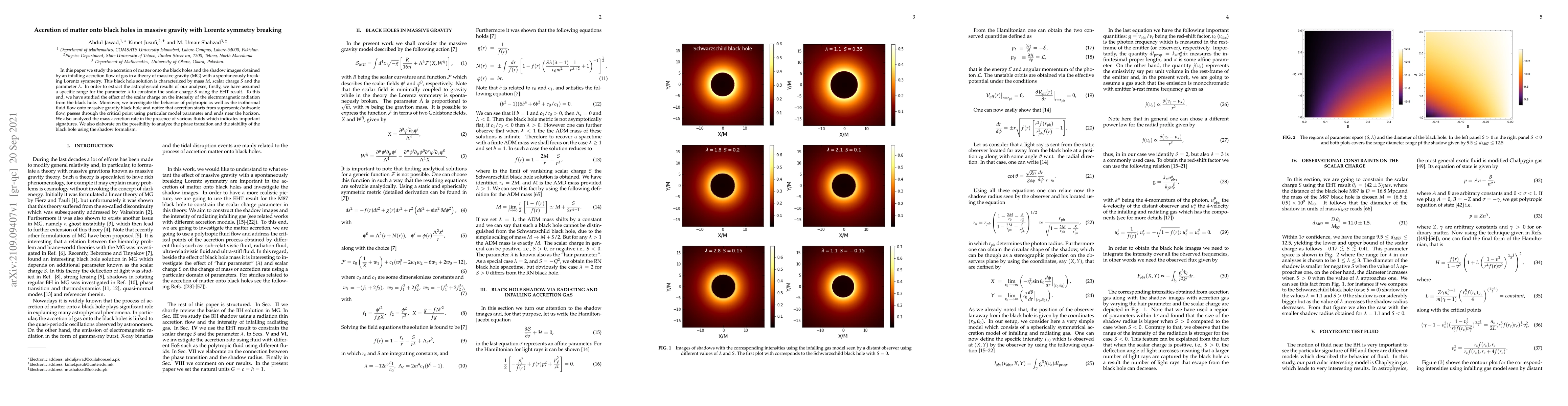 In this paper we study the accretion of matter onto the black holes and the shadow images obtained by an infalling accretion flow of gas in a theory of massive gravity (MG) with a spontaneously breaking Lorentz symmetry. This black hole solution is characterized by mass $M$, scalar charge $S$ and the parameter $\lambda$. In order to extract the astrophysical results of our analyses, firstly, we have assumed a specific range for the parameter $\lambda$ to constrain the scalar charge $S$ using the EHT result. To this end, we have studied the effect of the scalar charge on the intensity of the electromagnetic radiation from the black hole. Moreover, we investigate the behavior of polytropic as well as the isothermal fluid flow onto massive gravity black hole and notice that accretion starts from supersonic/subsonic flow, passes through the critical point using particular model parameter and ends near the horizon. We also analyzed the mass accretion rate in the presence of various fluids which indicates important signatures. We also elaborate on the possibility to analyze the phase transition and the stability of the black hole using the shadow formalism.