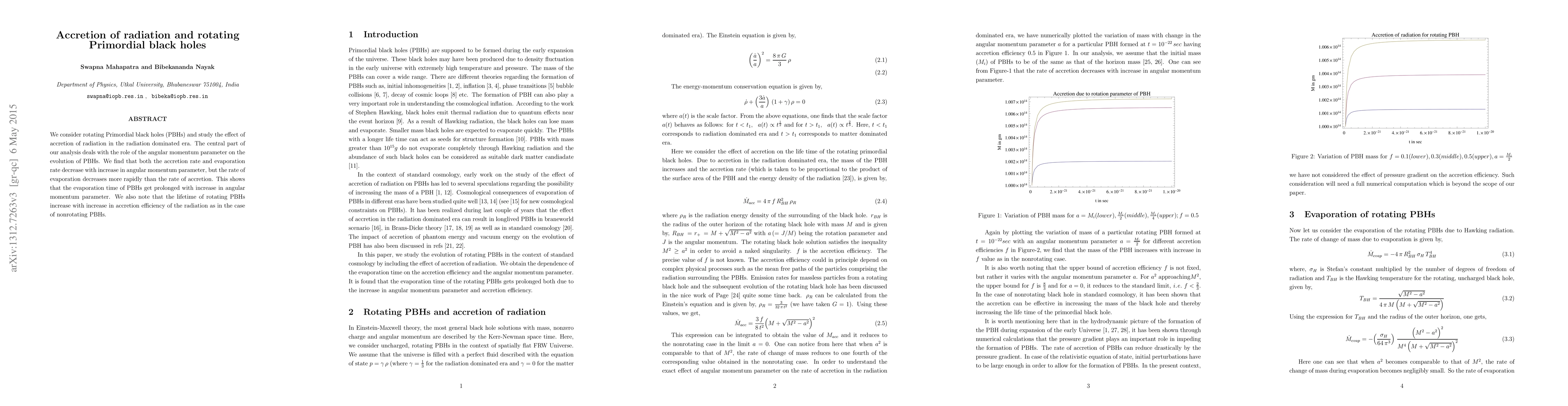 This paper investigates the accretion of radiation on rotating Primordial black holes (PBHs) in a radiation-dominated era, finding that higher angular momentum prolongs evaporation time. The study concludes that while both accretion and evaporation rates decrease with increased angular momentum, the evaporation rate diminishes more rapidly, thereby extending the lifetime of rotating PBHs.