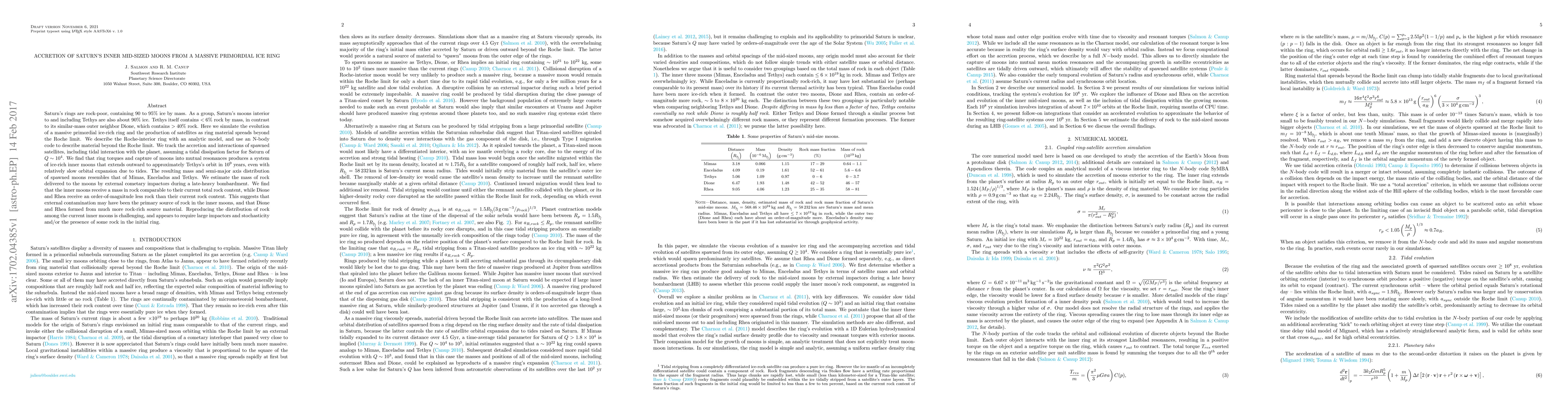 This paper simulates the formation of Saturn's inner mid-sized moons from a primordial ice-rich ring, showing that moons like Mimas and Enceladus formed primarily from external contamination rather than the initial ring. The study finds that the inner moons acquired a significant amount of rock from late heavy bombardments, contrasting with the rock-poor nature of their initial formation.