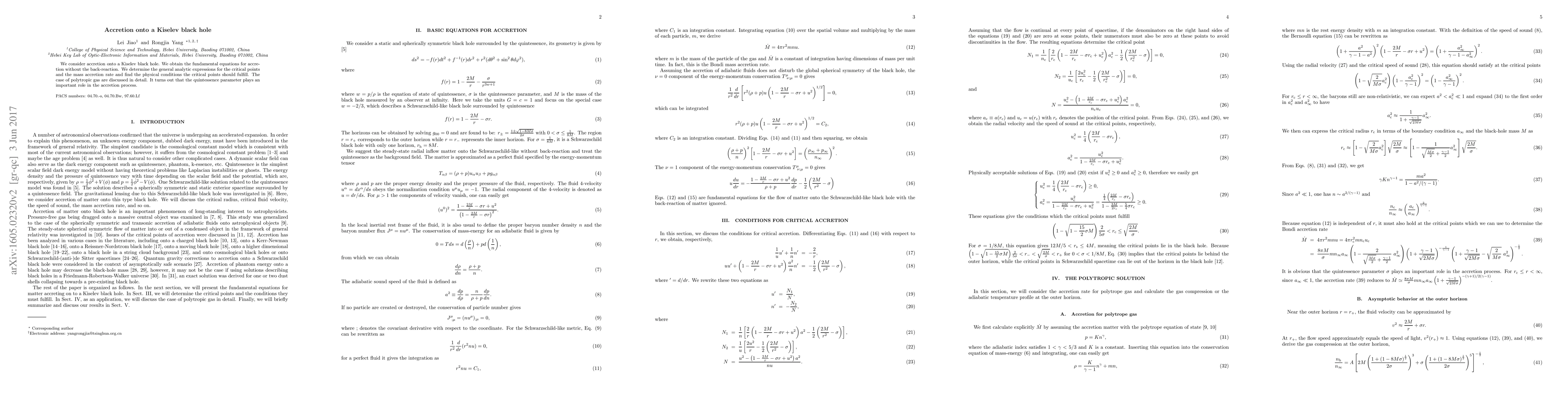 We consider accretion onto a Kiselev black hole. We obtain the fundamental equations for accretion without the back-reaction. We determine the general analytic expressions for the critical points and the mass accretion rate and find the physical conditions the critical points should fulfill. The case of polytropic gas are discussed in detail. It turns out that the quintessence parameter plays an important role in the accretion process.
