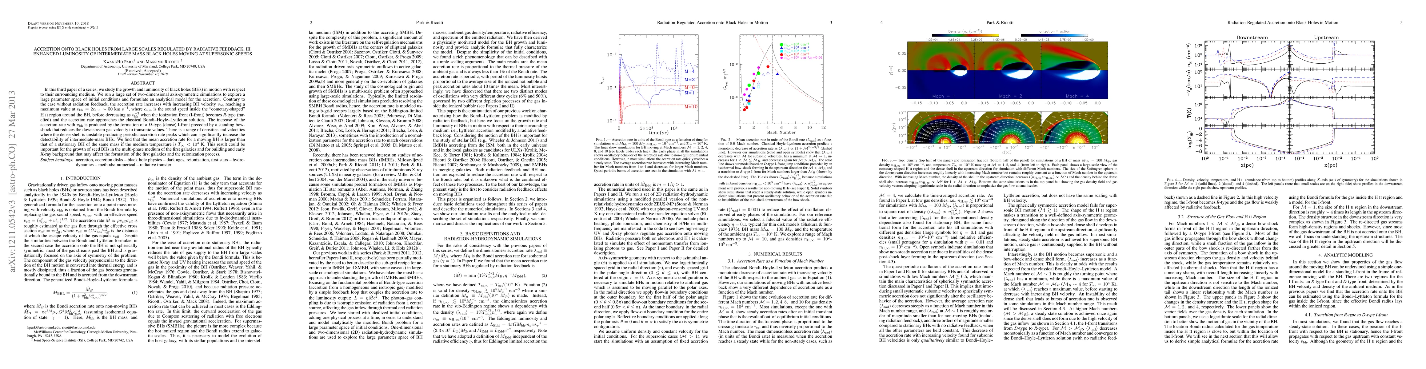 In this third paper of a series, we study the growth and luminosity of black holes (BHs) in motion with respect to their surrounding medium. We run a large set of two-dimensional (2D) axis-symmetric simulations to explore a large parameter space of initial conditions and formulate an analytical model for the accretion. Contrary to the case without radiation feedback, the accretion rate increases with increasing BH velocity $\vbh$ reaching a maximum value at $\vbh=2c_{\rm s,in}\sim 50$ km/s, where $c_{\rm s,in}$ is the sound speed inside the "cometary-shaped" \hii region around the BH, before decreasing as $\vbh^{-3}$ when the I-front becomes {\it R}-type (rarefied) and the accretion rate approaches the classical Bondi-Hoyle-Lyttleton solution. The increase of the accretion rate with $\vbh$ is produced by the formation of a {\it D}-type (dense) ionization front (I-front) preceded by a standing bow-shock that reduces the downstream gas velocity to transonic values. There is a range of densities and velocities where the dense shell is unstable producing periodic accretion rate peaks which can significantly increase the detectability of intermediate mass BHs. We find that the mean accretion rate for a moving BH is larger than that of a stationary BH of the same mass if the medium temperature is $T_\infty<10^4$ K. This result could be important for the growth of seed BHs in the multi-phase medium of the first galaxies and for building and early X-ray background that may affect the formation of the first galaxies and the reionization process.