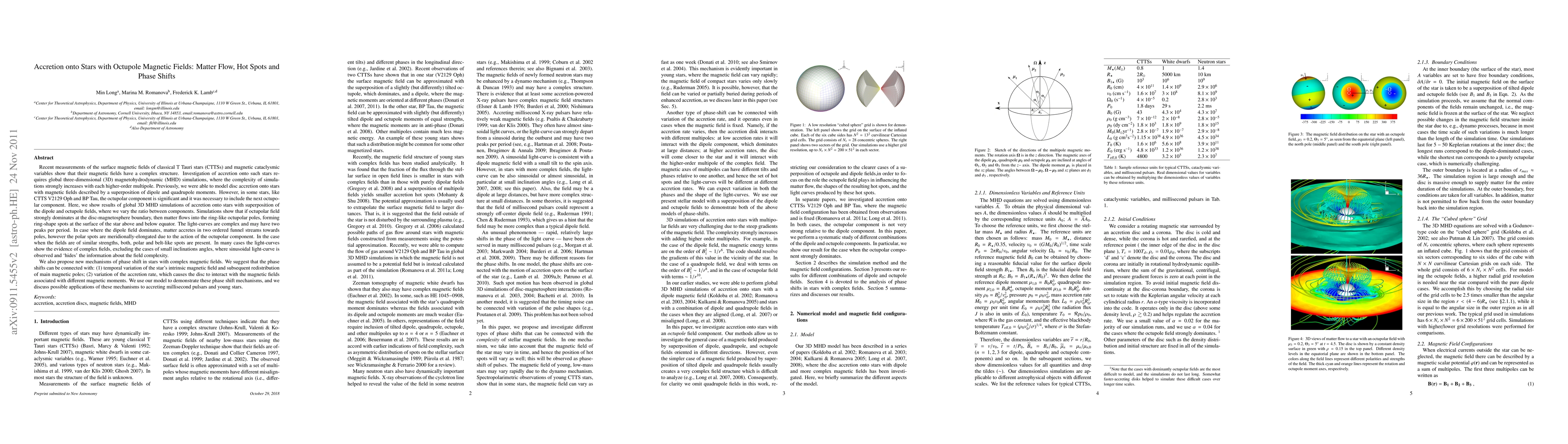 This paper presents global 3D MHD simulations of accretion onto stars with a superposition of dipole and octupole magnetic fields, revealing complex matter flows and light-curves influenced by the magnetic field ratio. It also proposes mechanisms for phase shifts in stars with complex magnetic fields, linked to temporal magnetic field variations and accretion rate changes.