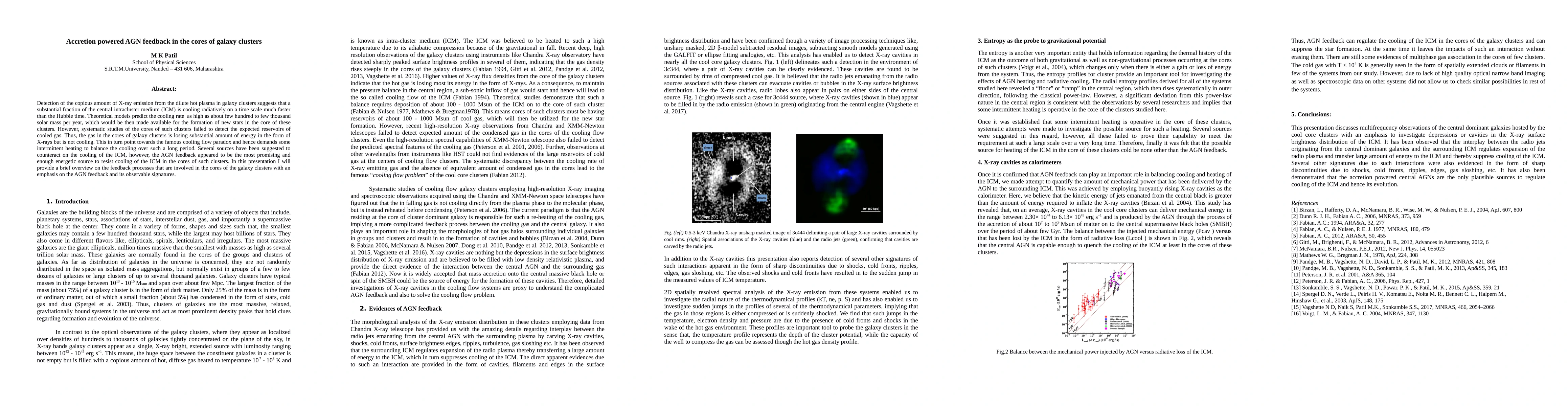 Detection of the copious amount of X-ray emission from the dilute hot plasma in galaxy clusters suggests that a substantial fraction of the central intracluster medium (ICM) is cooling radiatively on a time scale much faster than the Hubble time. Theoretical models predict the cooling rate as high as about few hundred to few thousand solar mass per year, which would be then made available for the formation of new stars in the core of these clusters. However, systematic studies of the cores of such clusters failed to detect the expected reservoirs of cooled gas. Thus, the gas in the cores of galaxy clusters is losing substantial amount of energy in the form of X-rays but is not cooling. This in turn point towards the famous cooling flow paradox and hence demands some intermittent heating to balance the cooling over such a long period. Several sources have been suggested to counteract on the cooling of the ICM, however, the AGN feedback appeared to be the most promising and enough energetic source to resist cooling of the ICM in the cores of such clusters. In this presentation I will provide a brief overview on the feedback processes that are involved in the cores of the galaxy clusters with an emphasis on the AGN feedback and its observable signatures.