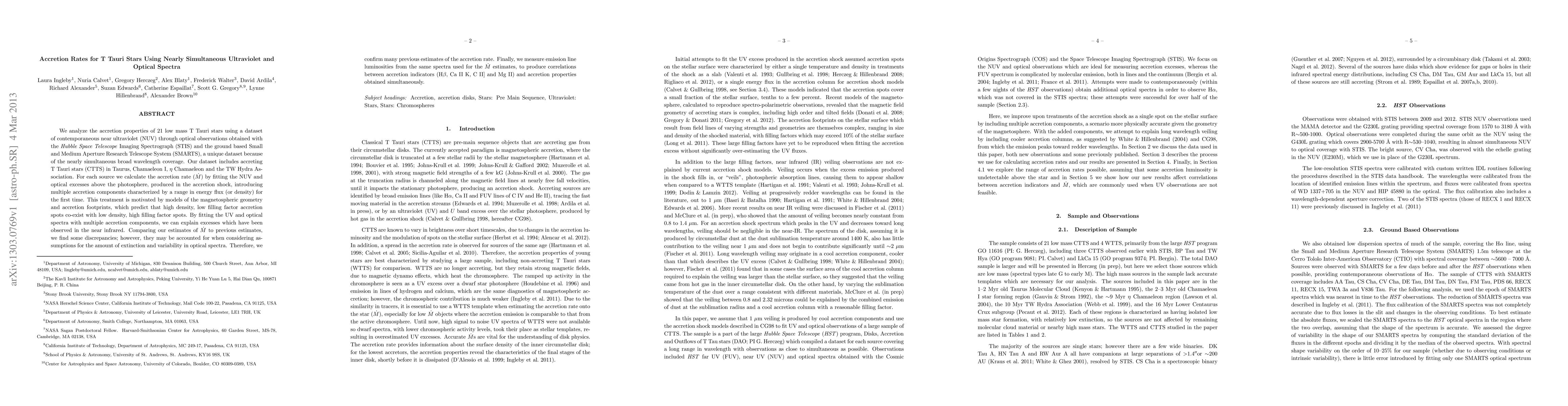 This study analyzes the accretion rates of 21 T Tauri stars using nearly simultaneous ultraviolet and optical spectra from the Hubble Space Telescope and ground-based telescopes. The authors introduce multiple accretion components to better fit the observed spectra, confirming previous estimates while noting discrepancies that may arise from extinction and optical variability.