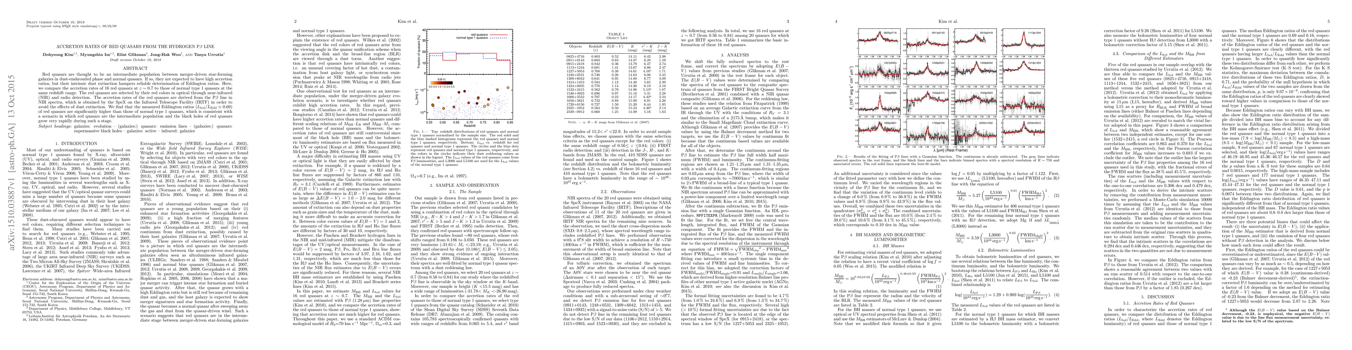 The study derives accretion rates of 16 red quasars at z ~ 0.7 using the Pβ line in NIR spectra, obtained with the SpeX instrument on the IRTF, to avoid dust extinction effects. These rates are compared to those of normal type 1 quasars at the same redshift range.