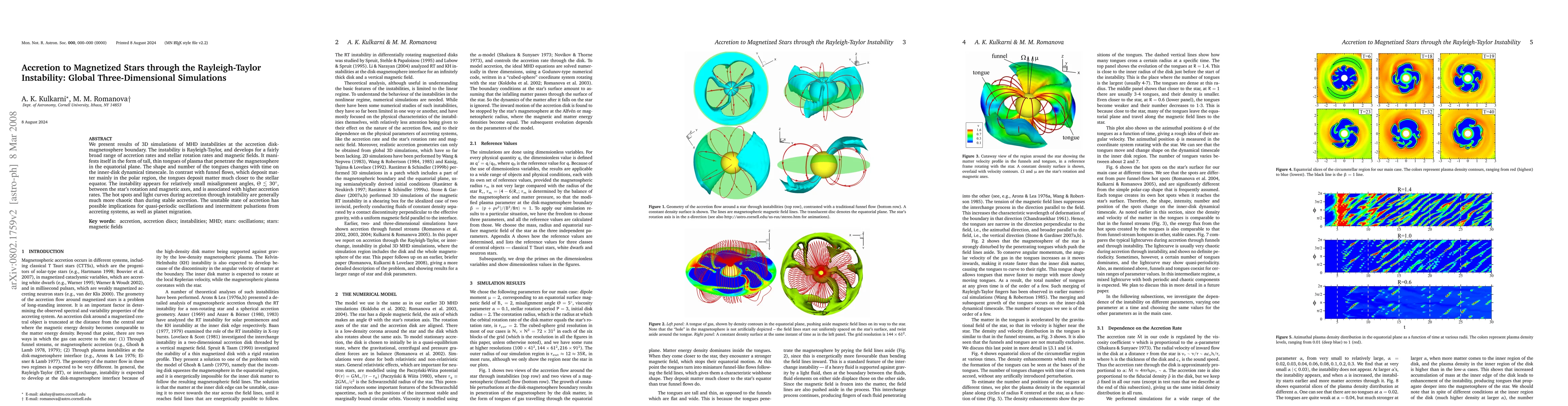 We present results of 3D simulations of MHD instabilities at the accretion disk-magnetosphere boundary. The instability is Rayleigh-Taylor, and develops for a fairly broad range of accretion rates and stellar rotation rates and magnetic fields. It manifests itself in the form of tall, thin tongues of plasma that penetrate the magnetosphere in the equatorial plane. The shape and number of the tongues changes with time on the inner-disk dynamical timescale. In contrast with funnel flows, which deposit matter mainly in the polar region, the tongues deposit matter much closer to the stellar equator. The instability appears for relatively small misalignment angles, $\Theta\lesssim30^\circ$, between the star's rotation and magnetic axes, and is associated with higher accretion rates. The hot spots and light curves during accretion through instability are generally much more chaotic than during stable accretion. The unstable state of accretion has possible implications for quasi-periodic oscillations and intermittent pulsations from accreting systems, as well as planet migration.