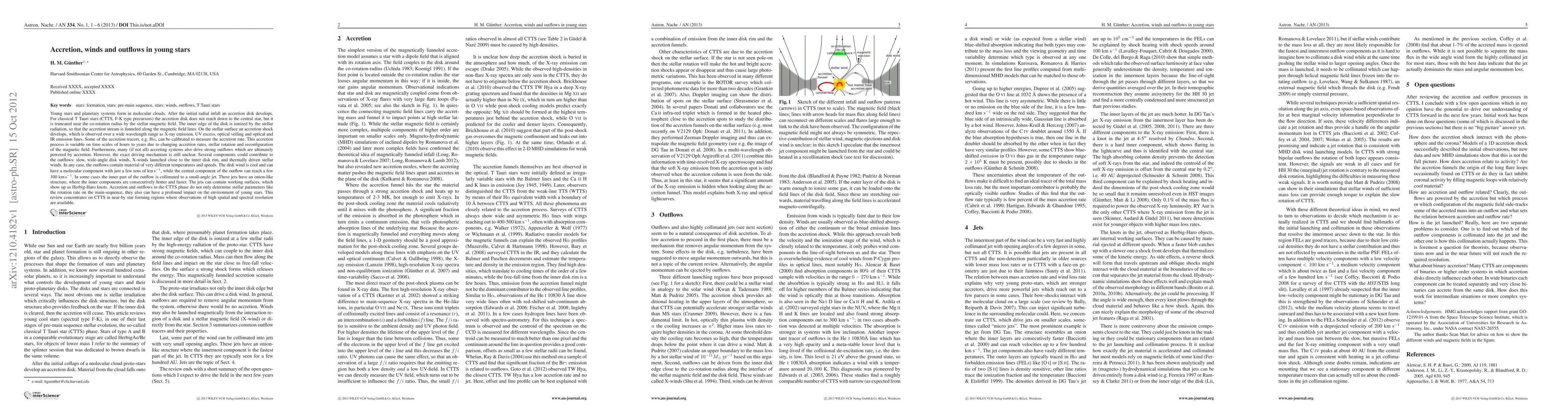 Young stars and planetary systems form in molecular clouds. For classical T Tauri stars (CTTS, F-K type precursors) the accretion disk does not reach down to the central star, but it is truncated near the co-rotation radius. The inner edge of the disk is ionized by the stellar radiation, so that the accretion stream is funneled along the magnetic field lines. On the stellar surface an accretion shock develops, which is observed over a wide wavelength range as X-ray emission, UV excess, optical veiling and optical and IR emission lines. Some of the accretion tracers, e.g. H\alpha, can be calibrated to measure the accretion rate. This accretion process is variable on time scales of hours to years due to changing accretion rates, stellar rotation and reconfiguration of the magnetic field. Furthermore, many accreting systems also drive strong outflows which are ultimately powered by accretion. Several components could contribute to the outflows: slow, wide-angle disk winds, X-winds launched close to the inner disk rim, and thermally driven stellar winds. In any case, the outflows contain material of very different temperatures and speeds. The disk wind is cool and can have a molecular component with just a few tens of km/s, while the central component of the outflow can reach a few 100 km/s. In some cases the inner part of the outflow is collimated to a small-angle jet. These jets have an onion-like structure, where the inner components are consecutively hotter and faster. The jets can contain working surfaces, which show up as Herbig-Haro knots. Accretion and outflows in the CTTS phase do not only determine stellar parameters like the rotation rate on the main-sequence, they also can have a profound impact on the environment of young stars. This review concentrates on CTTS in near-by star forming regions where observations of high spatial and spectral resolution are available.