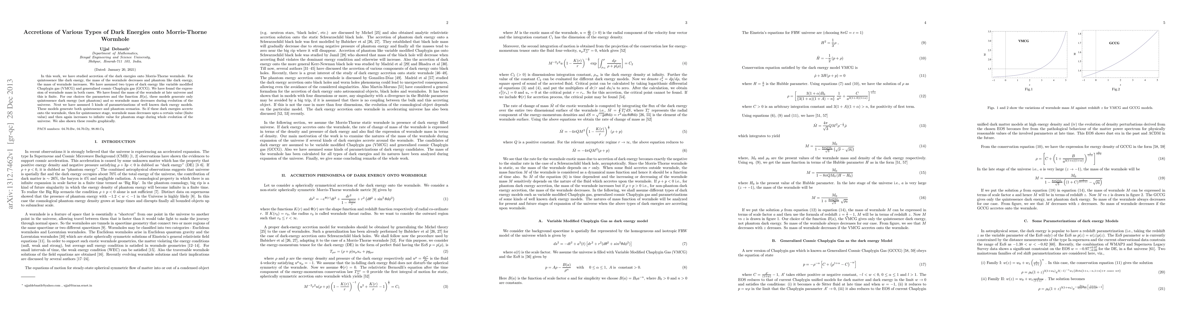 This research investigates the accretion of various dark energy types onto Morris-Thorne wormholes, finding that quintessence dark energy decreases wormhole mass while phantom dark energy increases it. Models like VMCG and GCCG were examined, showing that the wormhole mass decreases in the late universe, and a variety of parametrizations can generate both quintessence and phantom behaviors, leading to complex mass evolution patterns depicted graphically.