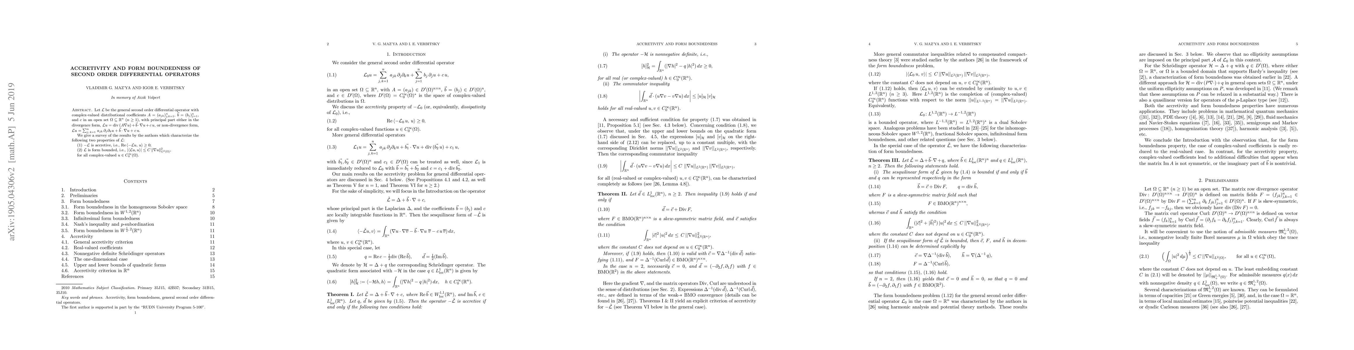 Let $\mathcal{L}$ be the general second order differential operator with complex-valued distributional coefficients $A=(a_{jk})_{j, k=1}^n$, $\vec{b}=(b_{j})_{j=1}^n$, and $c$ in an open set $\Omega \subseteq \mathbb{R}^n$ ($n \ge 1$), with principal part either in the divergence form, $\mathcal{L} u= {\rm div} \, (A \nabla u) + \vec{b} \cdot\nabla u + c \, u$, or non-divergence form, $ \mathcal L u= \sum_{j, \, k=1}^n \, a_{jk} \, \partial_j \partial_k u + \vec{b} \cdot\nabla u + c \, u $. We give a survey of the results by the authors which characterize the following two properties of $\mathcal{L}$: (1) $-\mathcal{L}$ is accretive, i.e., ${\rm Re} \, \langle -\mathcal L u, \, u\rangle \ge 0$; (2) $\mathcal L$ is form bounded, i.e., $\vert \langle \mathcal L u, u \rangle \vert \le C \, \Vert \nabla u \Vert_{L^2(\Omega)}^2$, for all complex-valued $u \in C^\infty_0(\Omega)$.