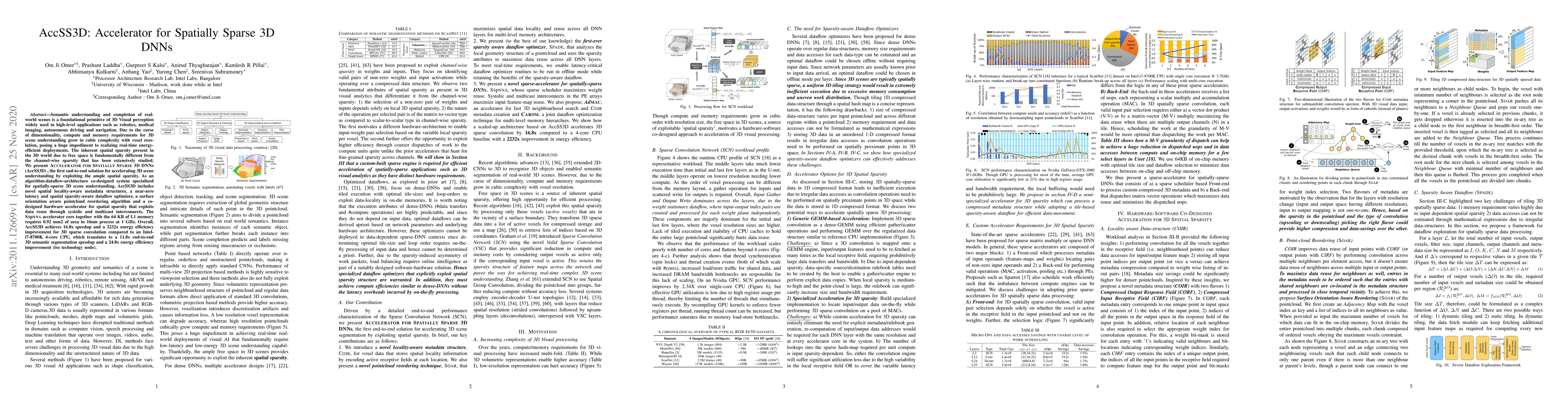 Semantic understanding and completion of real world scenes is a foundational primitive of 3D Visual perception widely used in high-level applications such as robotics, medical imaging, autonomous driving and navigation. Due to the curse of dimensionality, compute and memory requirements for 3D scene understanding grow in cubic complexity with voxel resolution, posing a huge impediment to realizing real-time energy efficient deployments. The inherent spatial sparsity present in the 3D world due to free space is fundamentally different from the channel-wise sparsity that has been extensively studied. We present ACCELERATOR FOR SPATIALLY SPARSE 3D DNNs (AccSS3D), the first end-to-end solution for accelerating 3D scene understanding by exploiting the ample spatial sparsity. As an algorithm-dataflow-architecture co-designed system specialized for spatially-sparse 3D scene understanding, AccSS3D includes novel spatial locality-aware metadata structures, a near-zero latency and spatial sparsity-aware dataflow optimizer, a surface orientation aware pointcloud reordering algorithm and a codesigned hardware accelerator for spatial sparsity that exploits data reuse through systolic and multicast interconnects. The SSpNNA accelerator core together with the 64 KB of L1 memory requires 0.92 mm2 of area in 16nm process at 1 GHz. Overall, AccSS3D achieves 16.8x speedup and a 2232x energy efficiency improvement for 3D sparse convolution compared to an Intel-i7-8700K 4-core CPU, which translates to a 11.8x end-to-end 3D semantic segmentation speedup and a 24.8x energy efficiency improvement (iso technology node)