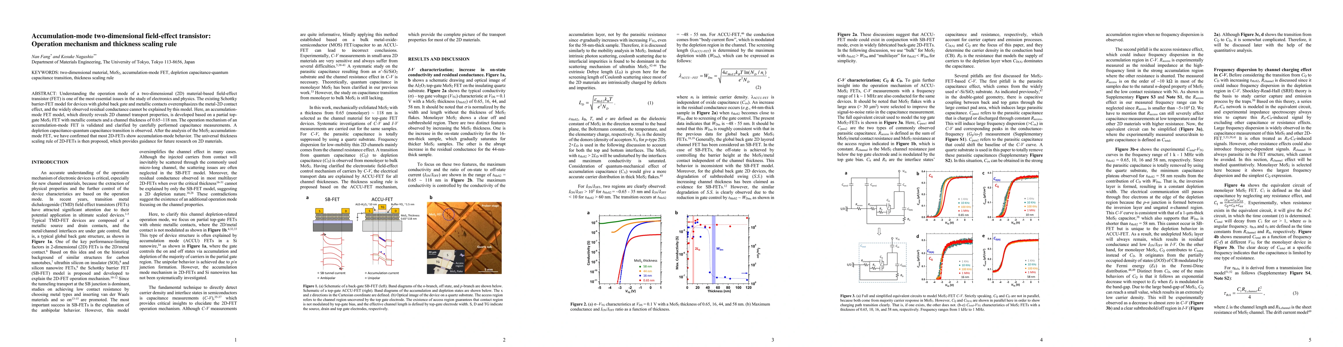 This paper develops an accumulation-mode FET model for two-dimensional material-based FETs, explaining residual conductance and validating the operation mechanism through capacitance measurements. It proposes a universal thickness scaling rule for 2D-FETs based on MoS2 studies.