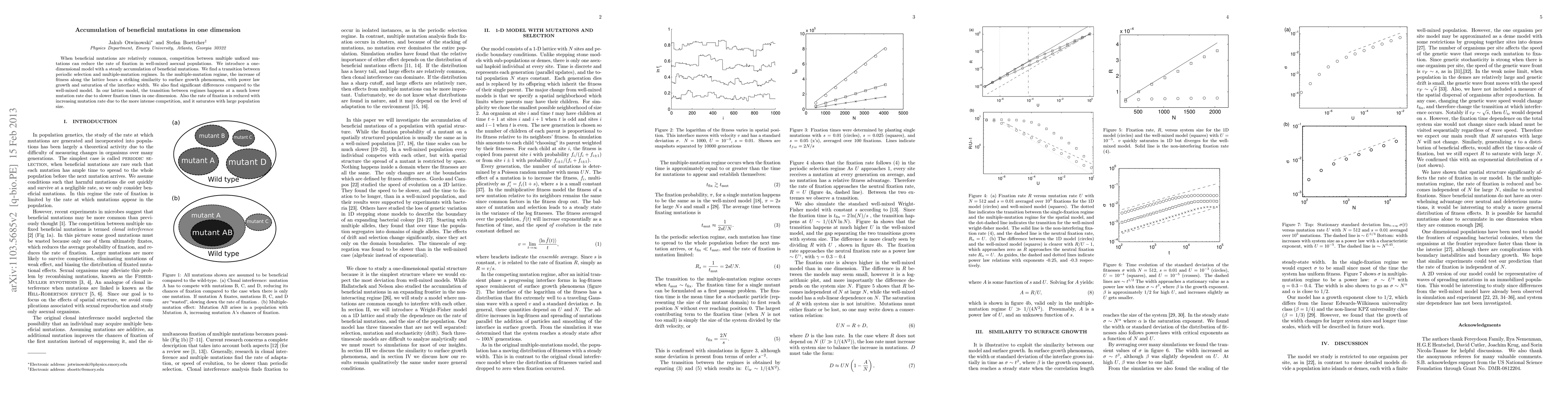 When beneficial mutations are relatively common, competition between multiple unfixed mutations can reduce the rate of fixation in well-mixed asexual populations. We introduce a one dimensional model with a steady accumulation of beneficial mutations. We find a transition between periodic selection and multiple-mutation regimes. In the multiple-mutation regime, the increase of fitness along the lattice bears a striking similarity to surface growth phenomena, with power law growth and saturation of the interface width. We also find significant differences compared to the well-mixed model. In our lattice model, the transition between regimes happens at a much lower mutation rate due to slower fixation times in one dimension. Also the rate of fixation is reduced with increasing mutation rate due to the more intense competition, and it saturates with large population size.