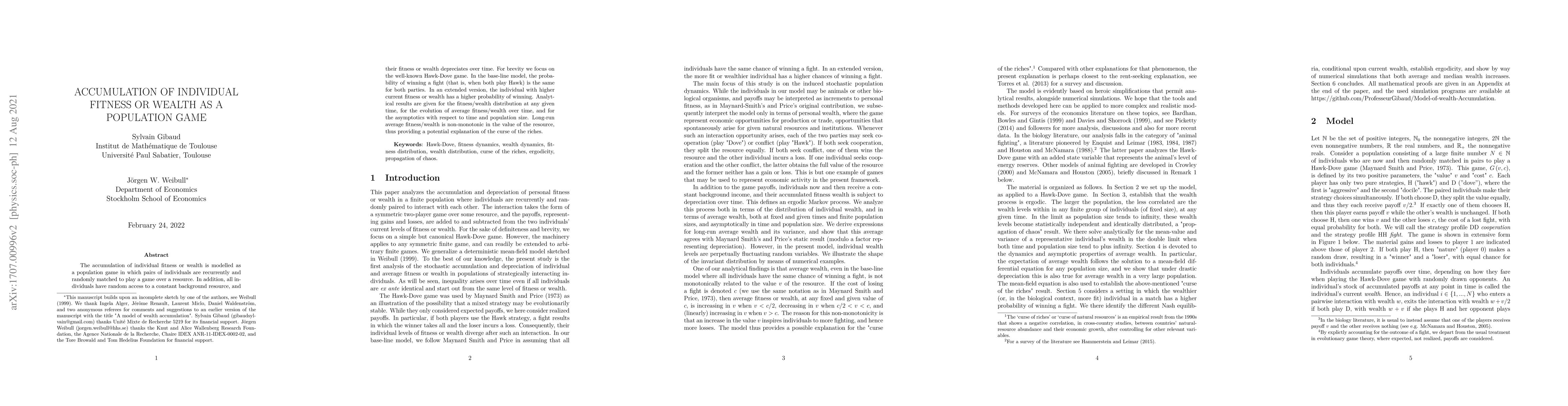 This paper models the accumulation of individual fitness or wealth as a population game, focusing on the Hawk-Dove game where pairs compete for resources. It examines how fitness/wealth evolves over time and how the distribution changes with varying resource values, revealing a non-monotonic relationship that may explain the "curse of the riches."