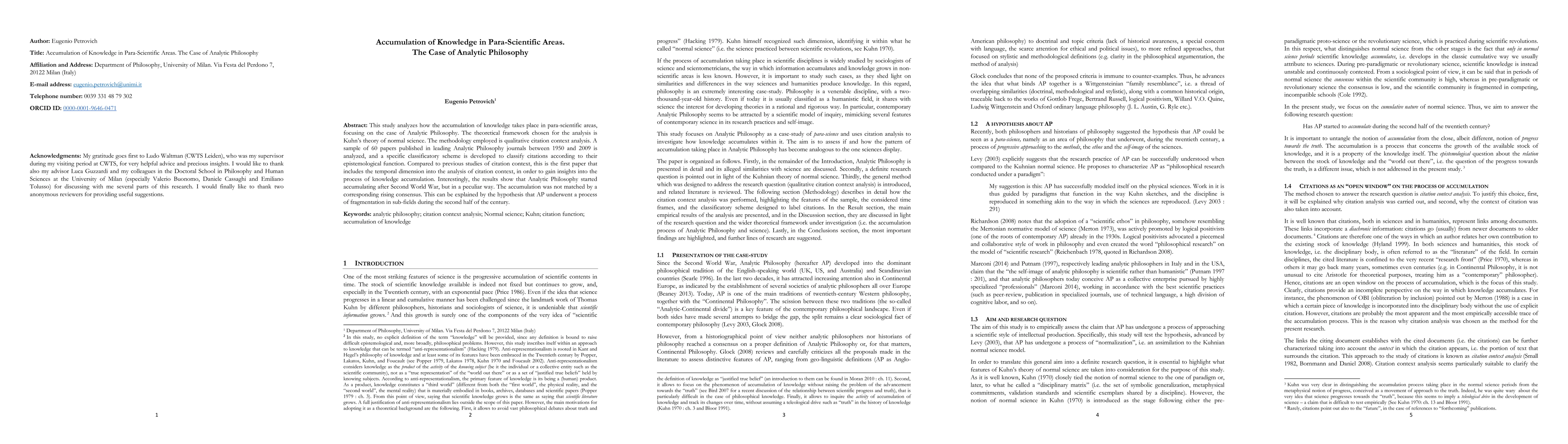 This study analyzes how the accumulation of knowledge takes place in para-scientific areas, focusing on the case of Analytic Philosophy. The theoretical framework chosen for the analysis is Kuhn's theory of normal science. The methodology employed is qualitative citation context analysis. A sample of 60 papers published in leading Analytic Philosophy journals between 1950 and 2009 is analyzed, and a specific classsificatory scheme is developed to classify citations according to their epistemological function. Compared to previous studies of citation context, this is the first paper that includes the temporal dimension into the analysis of citation context, in order to gain insights into the process of knowledge accumulation. Interestingly, the results show that Analytic Philosophy started accumulating after Second World War, but in a peculiar way. The accumulation was not matched by a corresponding rising consensus. This can be explained by the hypothesis that AP underwent a process of fragmentation in sub-fields during the second half of the century.