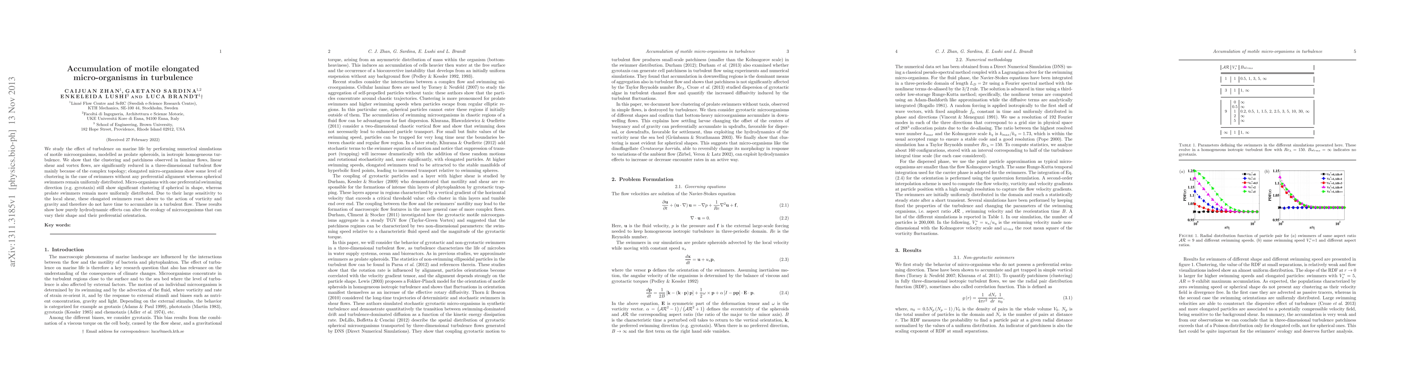 This study investigates how turbulence affects the distribution of motile elongated microorganisms, finding that turbulence reduces clustering compared to laminar flows due to complex flow topology. While elongated swimmers exhibit some clustering, they remain more uniformly distributed than spherical swimmers, highlighting the influence of hydrodynamic effects on microbial ecology.