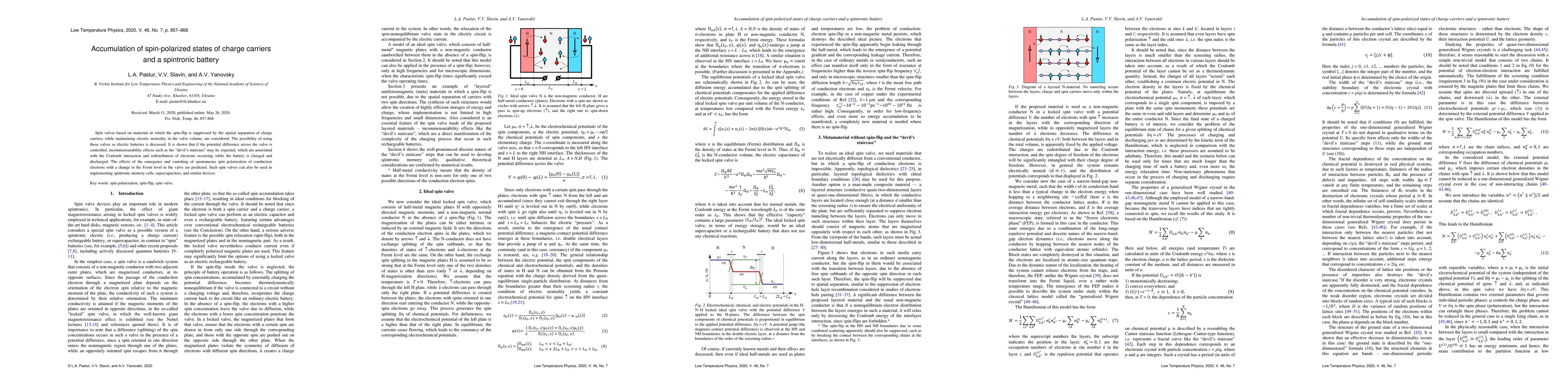 Spin valves based on materials in which the spin-flip is suppressed by the spatial separation of charge carriers, while maintaining electric neutrality in the valve volume, are considered. The possibility of using these valves as electric batteries is discussed. It is shown that if the potential difference across the valve is controlled, incommensurability effects such as the "devil's staircase" may be expected, which are associated with the Coulomb interaction and redistribution of electrons occurring while the battery is charged and discharged. The effects of the emergence and vanishing of spontaneous spin polarization of conduction electrons with a change in the Fermi level in the valve are predicted. Such spin valves can also be used in implementing spintronic memory cells, supercapacitors, and similar devices.