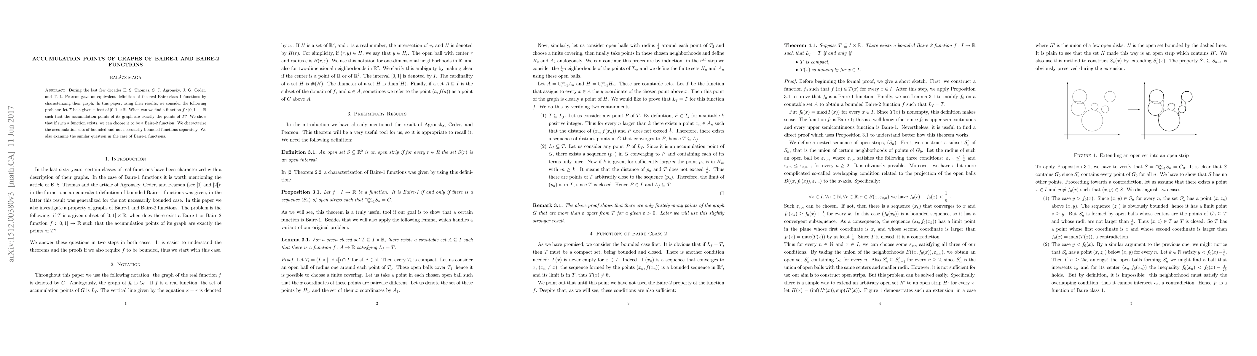 During the last few decades E. S. Thomas, S. J. Agronsky, J. G. Ceder, and T. L. Pearson gave an equivalent definition of the real Baire class 1 functions by characterizing their graph. In this paper, using their results, we consider the following problem: let $T$ be a given subset of $[0,1]\times\mathbb{R}$. When can we find a function $f:[0,1]\rightarrow\mathbb{R}$ such that the accumulation points of its graph are exactly the points of $T$? We show that if such a function exists, we can choose it to be a Baire-2 function. We characterize the accumulation sets of bounded and not necessarily bounded functions separately. We also examine the similar question in the case of Baire-1 functions.