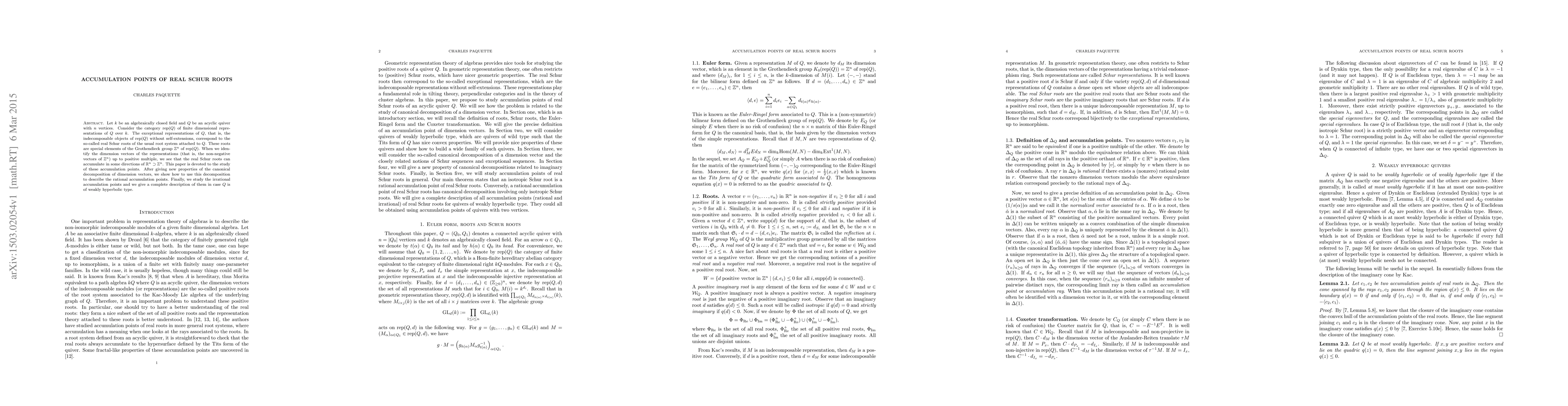 This paper investigates the accumulation points of real Schur roots in the Grothendieck group of representations of an acyclic quiver $Q$ over an algebraically closed field. It provides a complete description of both rational and irrational accumulation points, particularly for weakly hyperbolic quivers.
