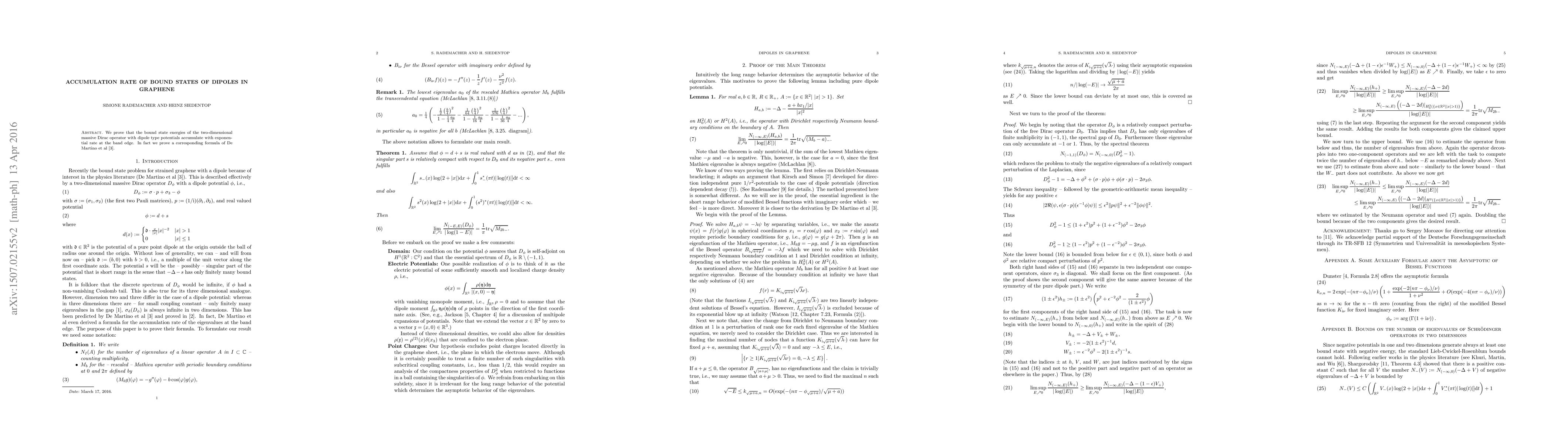 We prove that the bound state energies of the two-dimensional massive Dirac operator with dipole type potentials accumulate with exponentials rate at the band edge. In fact we prove a corresponding formula of De Martino et al (2014).