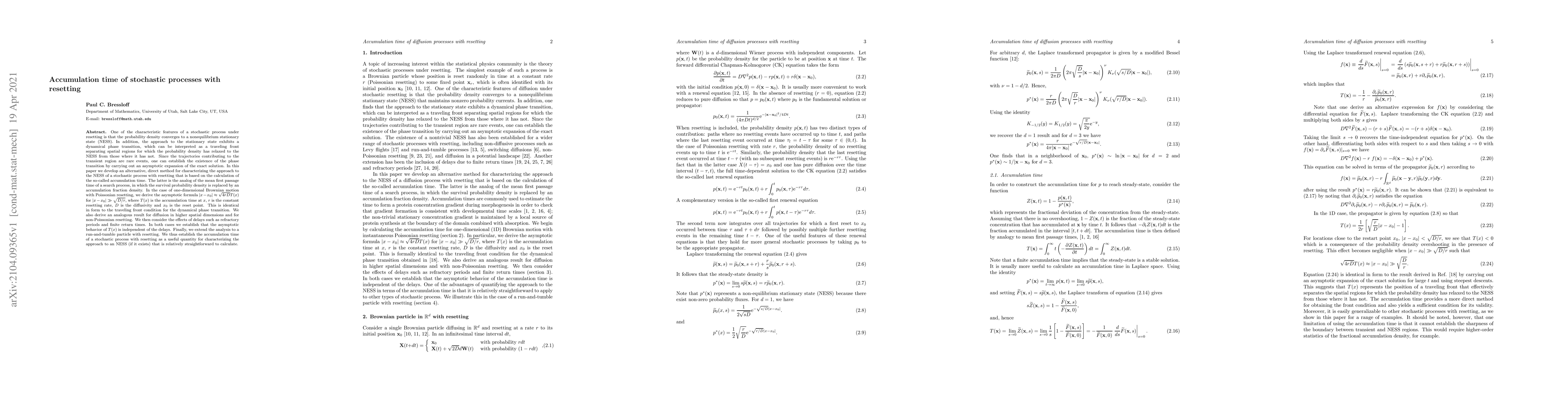 The paper introduces and develops the concept of accumulation time as a useful quantity for characterizing the approach to a NESS in stochastic processes with resetting, providing explicit formulas and asymptotic analyses.