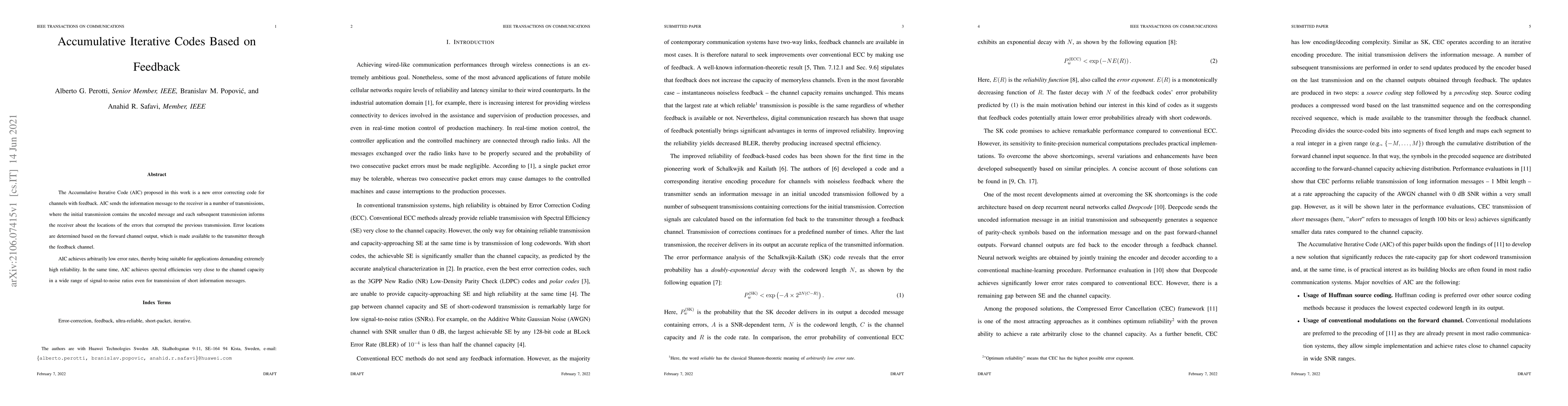 The Accumulative Iterative Code (AIC) is a novel error-correcting code for channels with feedback, designed to achieve arbitrarily low error rates and high spectral efficiency, making it suitable for applications requiring extreme reliability. AIC iteratively corrects errors by transmitting error locations based on feedback from the receiver.